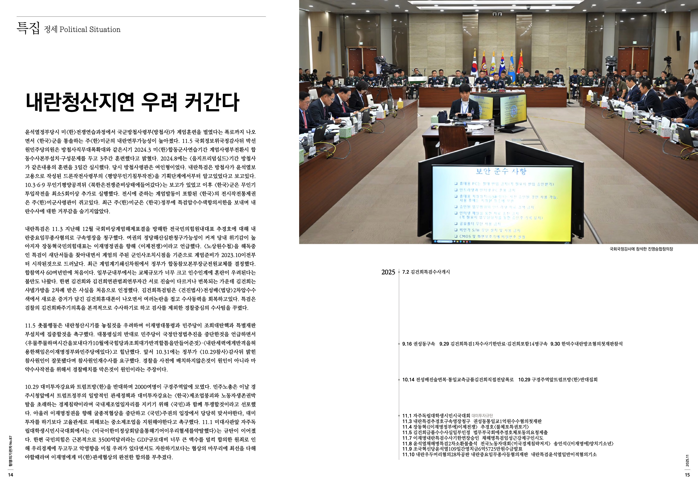 내란특검은 11.3 지난해 12월 국회비상계엄해제표결을 방해한 전국민의힘원내대표 추경호에 대해 내란중요임무종사혐의로 구속영장을 청구했다. 여권의 정당해산심판청구가능성이 커져 당내 위기감이 높아지자 장동혁국민의힘대표는 이재명정권을 향해 <이제전쟁>이라고 언급했다. <노상원수첩>을 해독중인 특검이 새단서들을 찾아내면서 계엄의 주된 군인사조치시점을 기준으로 계엄준비가 2023.10이전부터 시작된것으로 드러났다. 최근 계엄계기쇄신차원에서 정부가 합동참모본부장군전원교체를 결정했다. 합참역사 60여년만에 처음이다. 일부군내부에서는 교체규모가 너무 크고 인수인계에 혼란이 우려된다는 불만도 나왔다. 한편 김건희와 김건희연관범죄연루자간 서로 진술이 다르거나 번복되는 가운데 김건희는 샤넬가방을 2차례 받은 사실을 처음으로 인정했다. 김건희특검팀은 <건진법사>전성배<법당>2차압수수색에서 새로운 증거가 담긴 김건희휴대폰이 나오면서 여러논란을 접고 수사동력을 회복하고있다. 특검은 검찰의 김건희봐주기의혹을 본격적으로 수사하기로 하고 검사를 제외한 경찰중심의 수사팀을 꾸렸다.