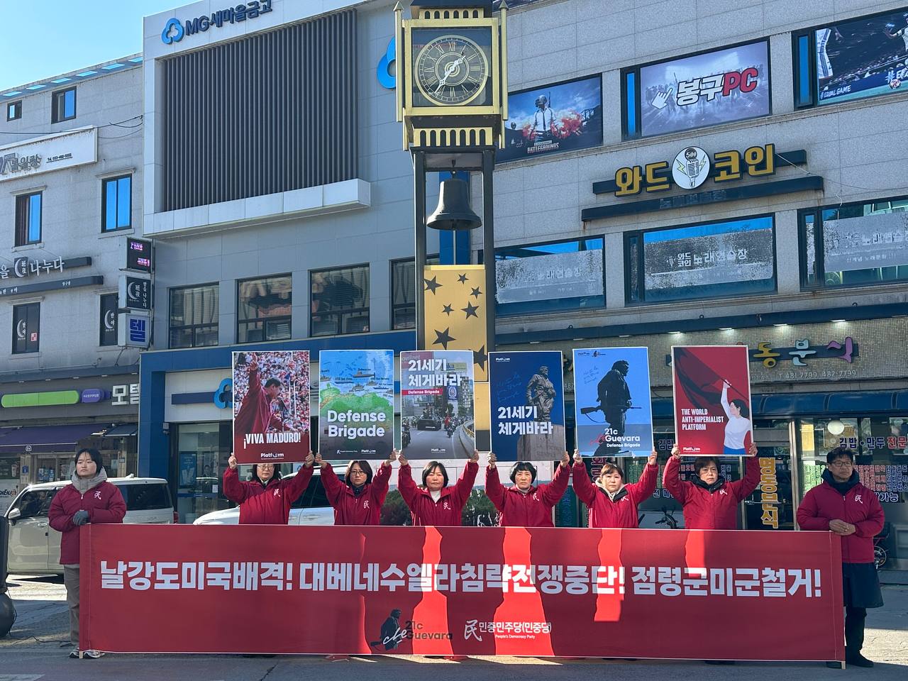 21일 21세기체게바라(Defense Brigade)·민중민주당(민중당)은 앙구터미널앞에서 <날강도미국배격! 대베네수엘라침략전쟁중단! 점령군미군철거!> 정당연설회를 진행했다.