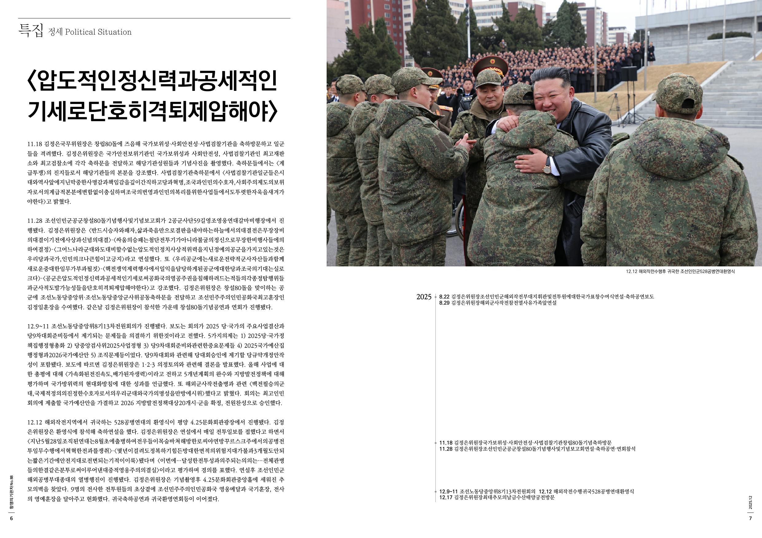 12.9~11 조선노동당중앙위8기13차전원회의가 진행됐다. 보도는 회의가 2025 당·국가의 주요사업결산과 당9차대회준비등에서 제기되는 문제들을 의결하기 위한것이라고 전했다. 5가지의제는 1) 2025당·국가정책집행정형총화 2) 당중앙검사위2025사업정형 3) 당9차대회준비와관련한중요문제들 4) 2025국가예산집행정형과2026국가예산안 5) 조직문제등이었다. 당9차대회와 관련해 당대회승인에 제기할 당규약개정안작성이 포함됐다. 보도에 따르면 김정은위원장은 1·2·3 의정토의와 관련해 결론을 발표했다. 올해 사업에 대한 총평에 대해 <가속화된전진속도,배가된자생력>이라고 전하고 5개년계획의 완수와 지방발전정책에 대해 평가하며 국가방위력의 현대화방침에 대한 성과를 언급했다. 또 해외군사작전출병과 관련 <백전필승의군대,국제적정의의진정한수호자로서의우리군대와국가의명성을만방에시위>했다고 밝혔다. 회의는 최고인민회의에 제출할 국가예산안을 가결하고 2026 지방발전정책대상20개시·군을 확정, 전원찬성으로 승인했다.