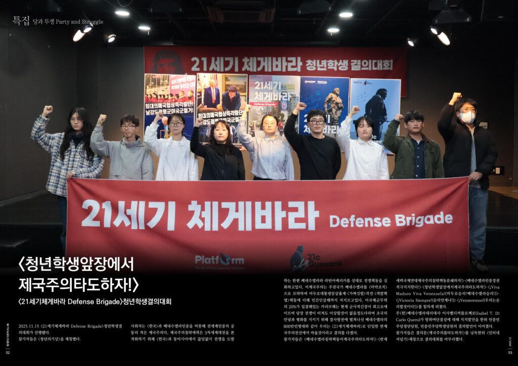 미제국주의에 위협당하는 베네수엘라의 처지와 조건은 결코 <한국>과 다르지않다. <한국>에는 이미 2만8500명미군과 세계최대규모의 미군기지가 있고 해마다 대조선침략전쟁연습이 쉴새없이 벌어지고있다. 경제위기와 전쟁위기가 중첩된 <한국>의 처지, 자주권을 상실한채 미제국주의와 친미주구무리에 의해 생존권조차 철저히 유린당하는 조건에서 우리는 무엇을 해야하겠는가. 베네수엘라민중처럼, 베네수엘라민중과 같이 자신의 생존과 발전을 위해 우리의 무기를 들고 제국주의에 맞설수밖에 없다. 우리의 무기는 각성하고 단결한 청년학생을 비롯한 우리민중의 힘이다. 방위여단<21세기체게바라>는 우리스스로의 힘으로 조국의 평화, 민중의 생명과 안전을 지키는 유일한 방도다.