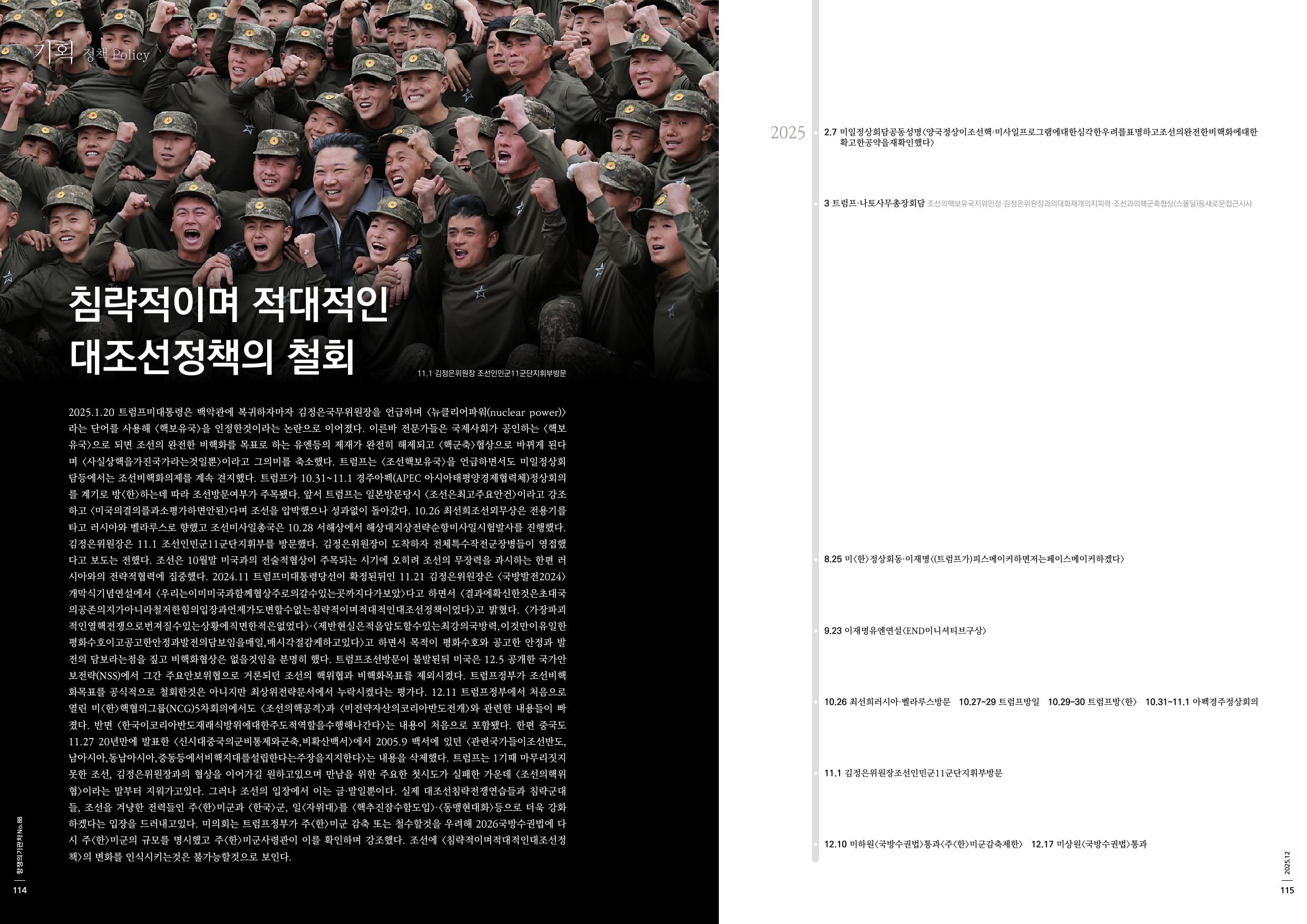 2025.1.20 트럼프미대통령은 백악관에 복귀하자마자 김정은국무위원장을 언급하며 <뉴클리어파워(nuclear power)>라는 단어를 사용해 <핵보유국>을 인정한것이라는 논란으로 이어졌다. 이른바 전문가들은 국제사회가 공인하는 <핵보유국>으로 되면 조선의 완전한 비핵화를 목표로 하는 유엔등의 제재가 완전히 해제되고 <핵군축>협상으로 바뀌게 된다며 <사실상핵을가진국가라는것일뿐>이라고 그의미를 축소했다. 트럼프는 <조선핵보유국>을 언급하면서도 미일정상회담등에서는 조선비핵화의제를 계속 견지했다. 트럼프가 10.31~11.1 경주아펙(APEC 아시아태평양경제협력체)정상회의를 계기로 방<한>하는데 따라 조선방문여부가 주목됐다. 앞서 트럼프는 일본방문당시 <조선은최고주요안건>이라고 강조하고 <미국의결의를과소평가하면안된>다며 조선을 압박했으나 성과없이 돌아갔다. 10.26 최선희조선외무상은 전용기를 타고 러시아와 벨라루스로 향했고 조선미사일총국은 10.28 서해상에서 해상대지상전략순항미사일시험발사를 진행했다. 김정은위원장은 11.1 조선인민군11군단지휘부를 방문했다. 김정은위원장이 도착하자 전체특수작전군장병들이 영접했다고 보도는 전했다. 조선은 10월말 미국과의 전술적협상이 주목되는 시기에 오히려 조선의 무장력을 과시하는 한편 러시아와의 전략적협력에 집중했다. 2024.11 트럼프미대통령당선이 확정된뒤인 11.21 김정은위원장은 <국방발전2024>개막식기념연설에서 <우리는이미미국과함께협상주로의갈수있는곳까지다가보았>다고 하면서 <결과에확신한것은초대국의공존의지가아니라철저한힘의입장과언제가도변할수없는침략적이며적대적인대조선정책이었다>고 밝혔다. <가장파괴적인열핵전쟁으로번져질수있는상황에직면한적은없었다>·<제반현실은적을압도할수있는최강의국방력,이것만이유일한평화수호이고공고한안정과발전의담보임을매일,매시각절감케하고있다>고 하면서 목적이 평화수호와 공고한 안정과 발전의 담보라는점을 짚고 비핵화협상은 없을것임을 분명히 했다. 트럼프조선방문이 불발된뒤 미국은 12.5 공개한 국가안보전략(NSS)에서 그간 주요안보위협으로 거론되던 조선의 핵위협과 비핵화목표를 제외시켰다. 트럼프정부가 조선비핵화목표를 공식적으로 철회한것은 아니지만 최상위전략문서에서 누락시켰다는 평가다. 12.11 트럼프정부에서 처음으로 열린 미<한>핵협의그룹(NCG)5차회의에서도 <조선의핵공격>과 <미전략자산의코리아반도전개>와 관련한 내용들이 빠졌다. 반면 <한국이코리아반도재래식방위에대한주도적역할을수행해나간다>는 내용이 처음으로 포함됐다. 한편 중국도 11.27 20년만에 발표한 <신시대중국의군비통제와군축,비확산백서>에서 2005.9 백서에 있던 <관련국가들이조선반도,남아시아,동남아시아,중동등에서비핵지대를설립한다는주장을지지한다>는 내용을 삭제했다. 트럼프는 1기때 마무리짓지못한 조선, 김정은위원장과의 협상을 이어가길 원하고있으며 만남을 위한 주요한 첫시도가 실패한 가운데 <조선의핵위협>이라는 말부터 지워가고있다. 그러나 조선의 입장에서 이는 글·말일뿐이다. 실제 대조선침략전쟁연습들과 침략군대들, 조선을 겨냥한 전력들인 주<한>미군과 <한국>군, 일<자위대>를 <핵추진잠수함도입>·<동맹현대화>등으로 더욱 강화하겠다는 입장을 드러내고있다. 미의회는 트럼프정부가 주<한>미군 감축 또는 철수할것을 우려해 2026국방수권법에 다시 주<한>미군의 규모를 명시했고 주<한>미군사령관이 이를 확인하며 강조했다. 조선에 <침략적이며적대적인대조선정책>의 변화를 인식시키는것은 불가능할것으로 보인다.