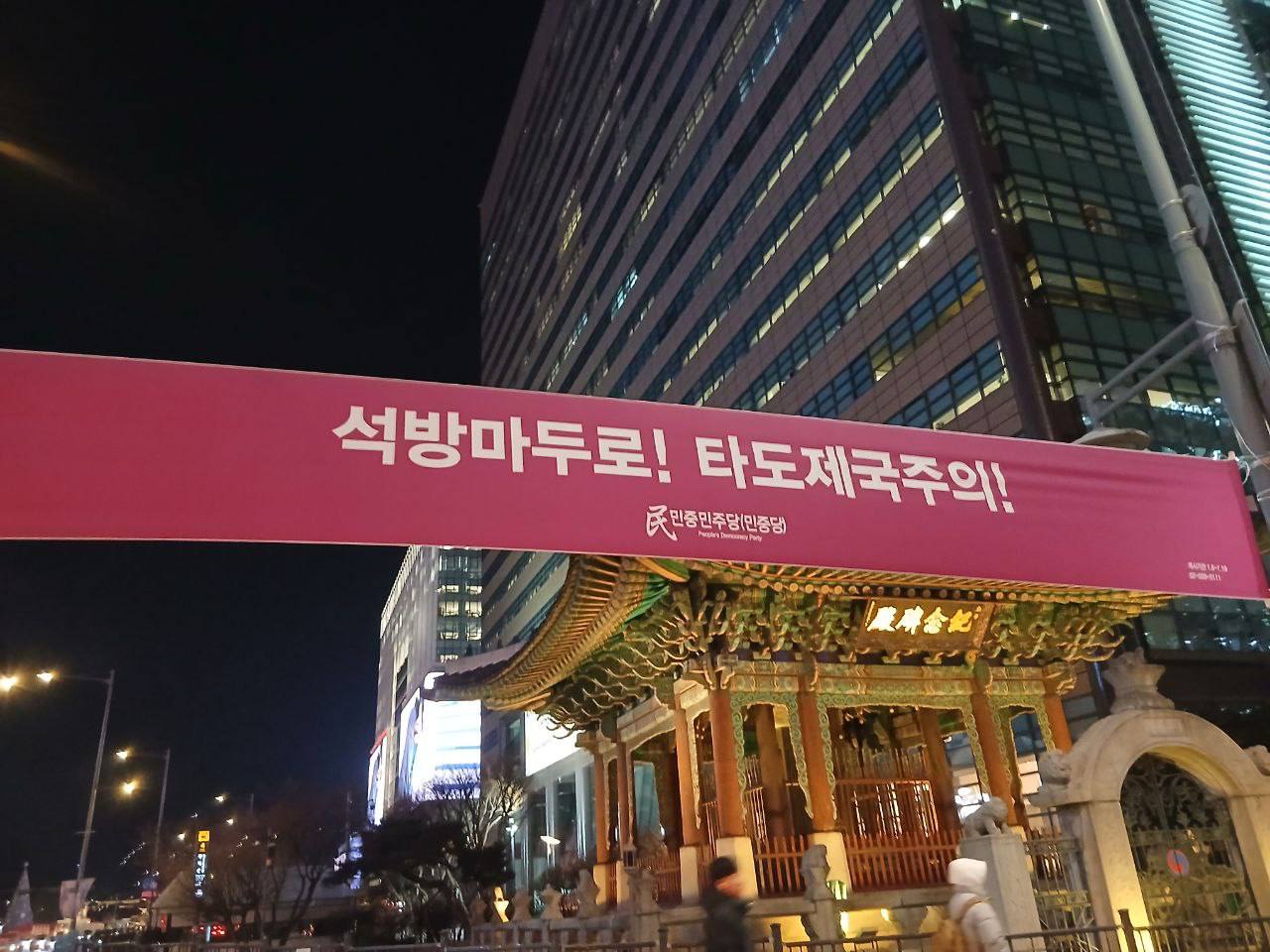 정당연설회실천 〈석방마두로! 타도제국주의!〉 민중민주당 광화문일대 가로막게시 2026년 1월 5일 FacebookTwitter 5일 민중민주당(민중당)은 광화문사거리·경복궁역앞·시청역앞·안국역앞에 가로막 <석방마두로! 타도제국주의!>, <FREE MADURO!>구호의 가로막을 게시했다.