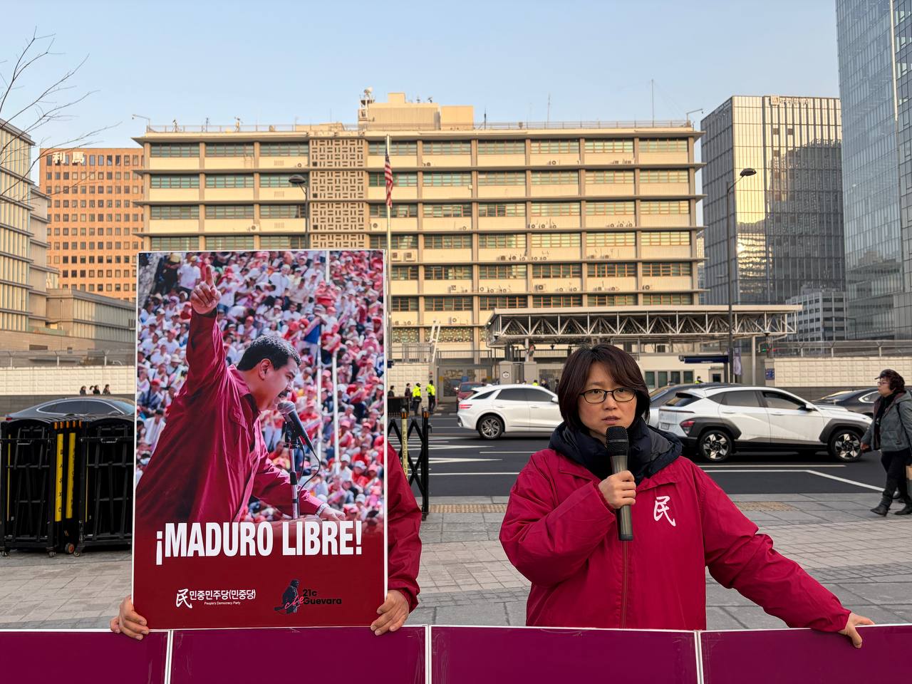 16일 민중민주당(민중당)은 미대사관앞에서 <석방마두로! 타도제국주의!> 22차정당연설회를 진행했다.