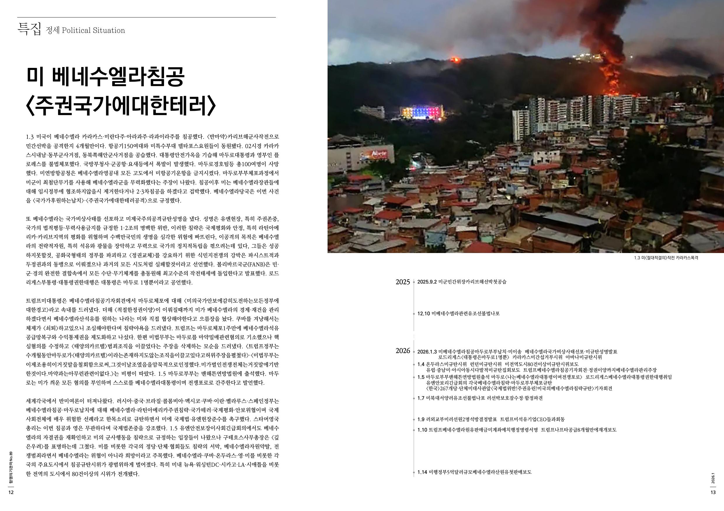 1.3 미국이 베네수엘라 카라카스·미란다주·아라과주·라과이라주를 침공했다. <반마약>카리브해군사작전으로 민간선박을 공격한지 4개월만이다. 항공기150여대와 미특수부대 델타포스요원들이 동원됐다. 02시경 카라카스시내남·동부군사거점, 동북쪽해안군사거점을 공습했다. 대통령안전가옥을 기습해 마두로대통령과 영부인 플로레스를 불법체포했다. 국방부청사·군공항·요새등에서 폭발이 발생했다. 마두로경호팀등 총100여명이 사망했다. 미연방항공청은 베네수엘라영공내 모든 고도에서 미항공기운항을 금지시켰다. 마두로부부체포과정에서 미군이 최첨단무기를 사용해 베네수엘라군을 무력화했다는 주장이 나왔다. 침공이후 미는 베네수엘라장관들에 대해 임시정부에 협조하지않을시 제거한다거나 2·3차침공을 하겠다고 겁박했다. 베네수엘라당국은 이번 사건을 <국가가후원하는납치>·<주권국가에대한테러공격>으로 규정했다.