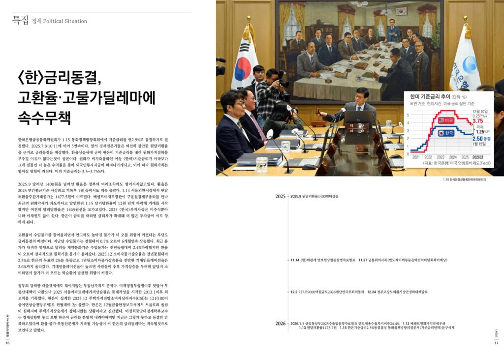 한국은행금융통화위원회가 1.15 통화정책방향회의에서 기준금리를 연2.5%로 동결하기로 결정했다. 2025.7·8·10·11에 이어 5연속이다. 앞서 경제전문가들은 여전히 불안한 원달러환율을 근거로 금리동결을 예상했다. 환율상승세에 굳이 한은이 기준금리를 내려 원화가치절하를 부추길 이유가 없다는것이 공론이다. 원화가 비기축통화인 이상 <한국>기준금리가 미국보다 크게 밑돌면 더 높은 수익률을 좇아 외국인투자자금이 빠져나가게되고, 이에 따라 원화가치는 떨어질 위험이 커진다. 미의 기준금리는 3.5~3.75%다.