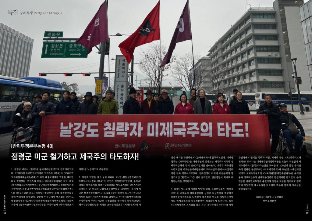 3. 점령이 있는 곳에 지배와 약탈이 있다. 트럼프정부가 <신먼로주의>를 내세우며 베네수엘라를 상대로 지상작전을 예고하고 반제민중정권전복을 노리면서 해적질로 원유를 강탈하는 것에서도 미제국주의의 야수적 본색이 적나라하게 드러난다. 특히 3차세계대전의 본격화를 앞둔 지금, 제국주의가 <한국>과 베네수엘라에서 벌이는 침략과 약탈, 지배와 점령, <제2의 카리브해위기>로 드러나는 대베네수엘라침략책동은 오늘의 최전선이 베네수엘라와 <한국>이라는 것을 보여준다. 100년에 걸친 우리민족의 일관한 투쟁구호인 <타도제국주의>와 90년전 스페인내전에서의 국제주의구호인 <노 빠사란!(통과할 수 없다)>은 우리민중과 진보적인류의 반제자주신념과 항전의지를 담고 있다. 우리민중은 반제반미투쟁에 총궐기해 점령군 미군을 철거하고 침략자며 약탈자인 제국주의를 타도하며 자주와 평화의 새세상을 앞당길 것이다.