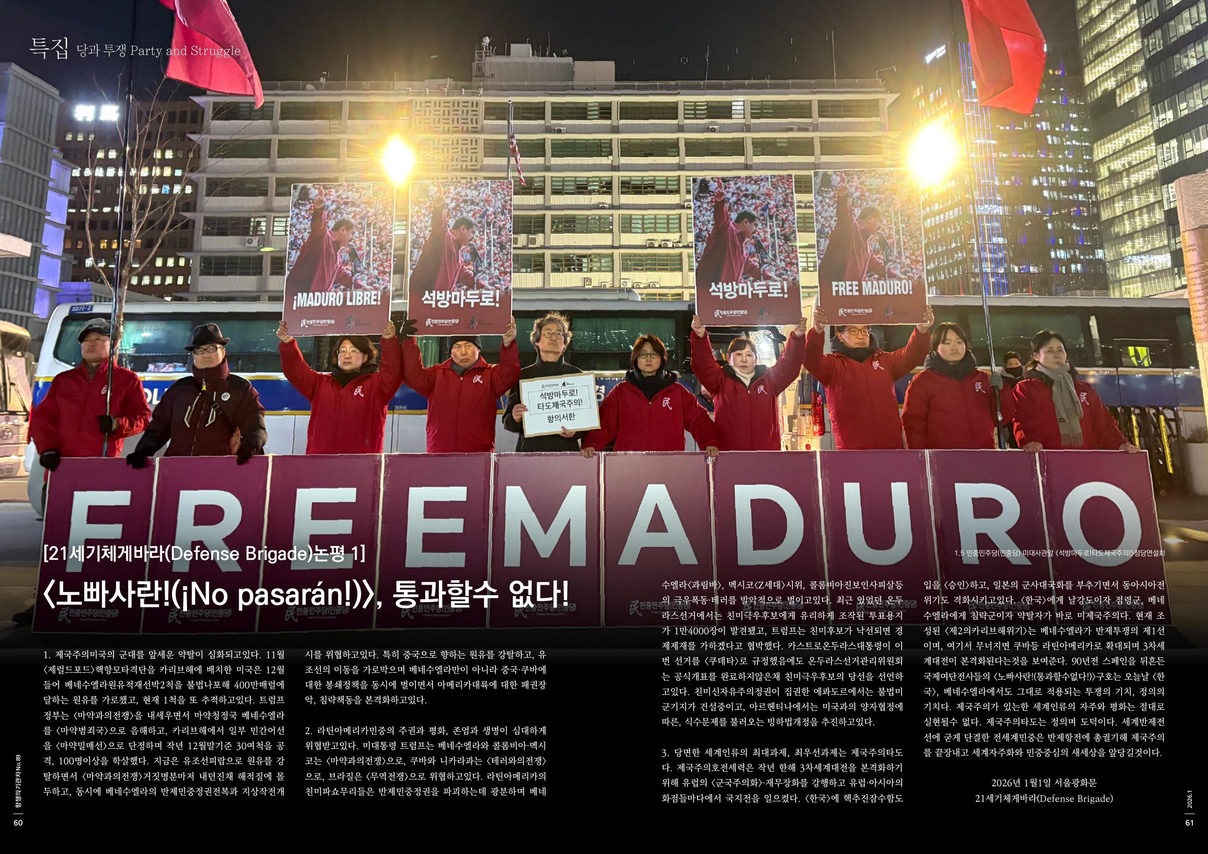 3. 당면한 세계인류의 최대과제, 최우선과제는 제국주의타도다. 제국주의호전세력은 작년 한해 3차세계대전을 본격화하기 위해 유럽의 <군국주의화>·재무장화를 강행하고 유럽·아시아의 화점들마다에서 국지전을 일으켰다. <한국>에 핵추진잠수함도입을 <승인>하고, 일본의 군사대국화를 부추기면서 동아시아전위기도 격화시키고 있다. <한국>에게 날강도이자 점령군, 베네수엘라에게 침략군이자 약탈자가 바로 미제국주의다. 현재 조성된 <제2의 카리브해위기>는 베네수엘라가 반제투쟁의 제1선이며, 여기서 무너지면 쿠바등 라틴아메리카로 확대되며 3차세계대전이 본격화된다는 것을 보여준다. 90년전 스페인을 뒤흔든 국제여단전사들의 <노 빠사란!(통과할 수 없다)>구호는 오늘날 <한국>, 베네수엘라에서도 그대로 적용되는 투쟁의 기치, 정의의 기치다. 제국주의가 있는 한 세계인류의 자주와 평화는 절대로 실현될 수 없다. 제국주의타도는 정의며 도덕이다. 세계반제전선에 굳게 단결한 전세계민중은 반제항전에 총궐기해 제국주의를 끝장내고 세계자주화와 민중중심의 새세상을 앞당길 것이다.