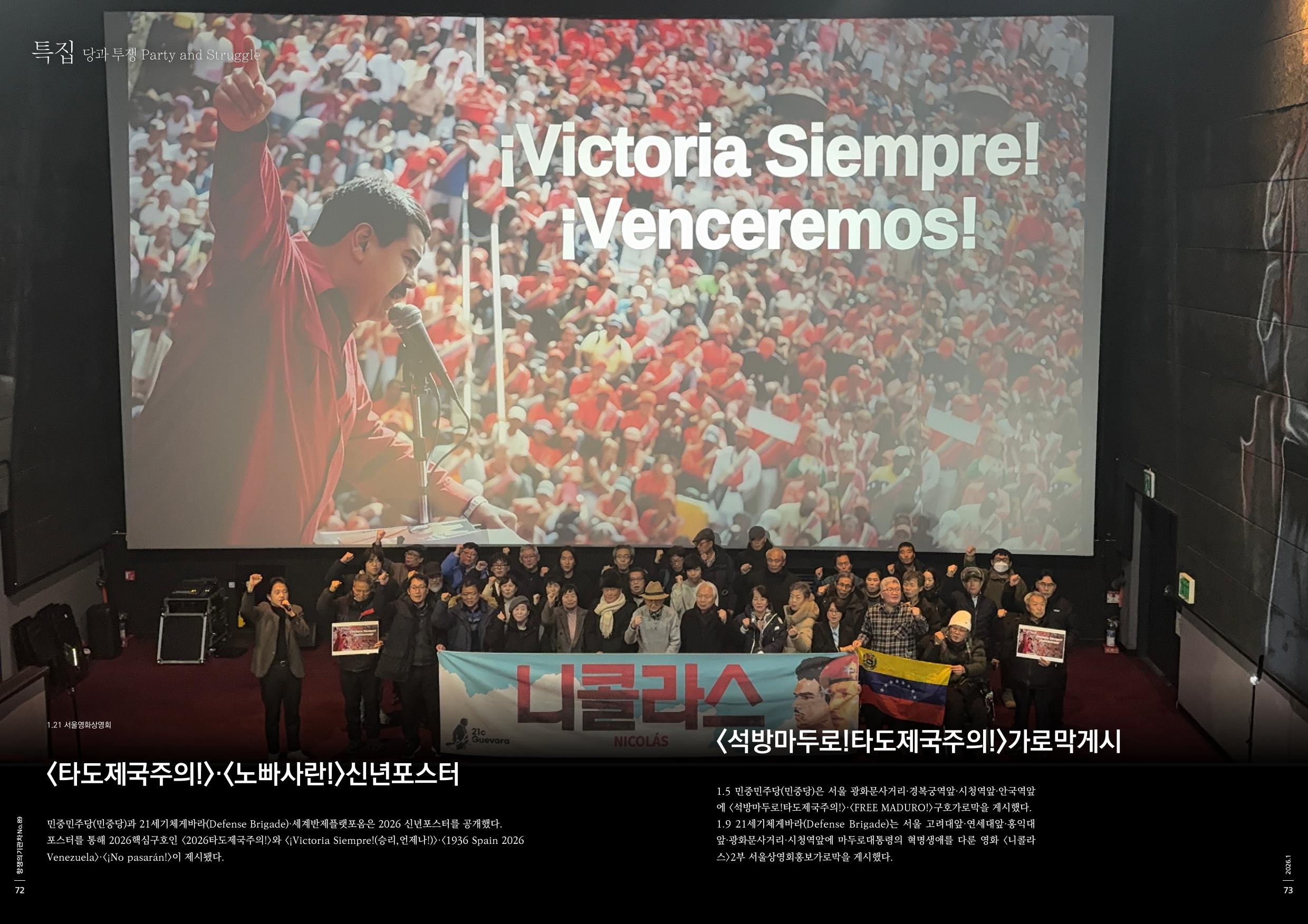 1.9 21세기체게바라(Defense Brigade)는 서울 고려대앞·연세대앞·홍익대앞·광화문사거리·시청역앞에 마두로대통령의 혁명생애를 다룬 영화 <니콜라스>2부 서울상영회홍보가로막을 게시했다