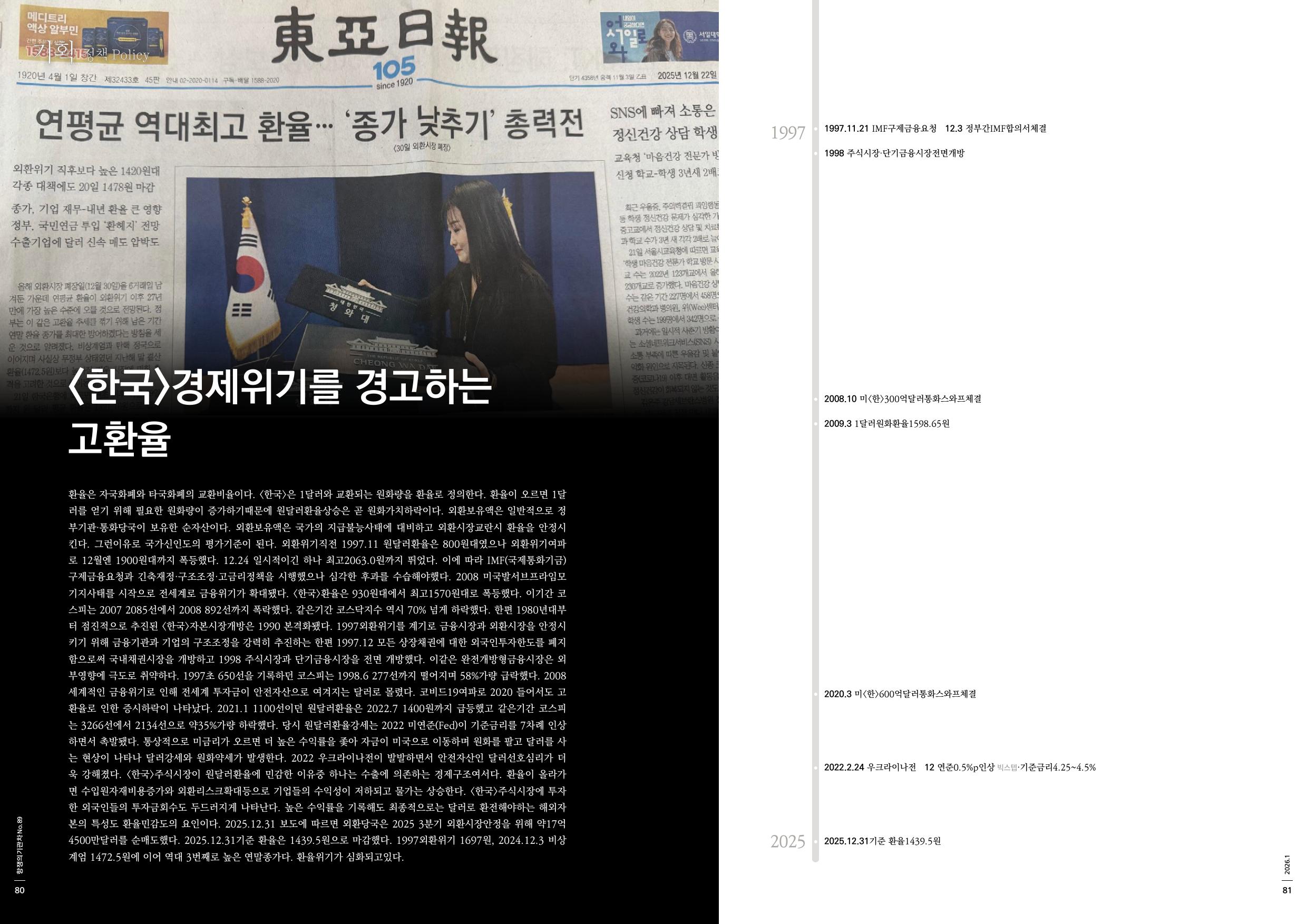 환율은 자국화폐와 타국화폐의 교환비율이다. <한국>은 1달러와 교환되는 원화량을 환율로 정의한다. 환율이 오르면 1달러를 얻기 위해 필요한 원화량이 증가하기때문에 원달러환율상승은 곧 원화가치하락이다. 외환보유액은 일반적으로 정부기관·통화당국이 보유한 순자산이다. 외환보유액은 국가의 지급불능사태에 대비하고 외환시장교란시 환율을 안정시킨다. 그런이유로 국가신인도의 평가기준이 된다. 외환위기직전 1997.11 원달러환율은 800원대였으나 외환위기여파로 12월엔 1900원대까지 폭등했다. 12.24 일시적이긴 하나 최고2063.0원까지 뛰었다. 이에 따라 IMF(국제통화기금)구제금융요청과 긴축재정·구조조정·고금리정책을 시행했으나 심각한 후과를 수습해야했다. 2008 미국발서브프라임모기지사태를 시작으로 전세계로 금융위기가 확대됐다. <한국>환율은 930원대에서 최고1570원대로 폭등했다. 이기간 코스피는 2007 2085선에서 2008 892선까지 폭락했다. 같은기간 코스닥지수 역시 70% 넘게 하락했다. 한편 1980년대부터 점진적으로 추진된 <한국>자본시장개방은 1990 본격화됐다. 1997외환위기를 계기로 금융시장과 외환시장을 안정시키기 위해 금융기관과 기업의 구조조정을 강력히 추진하는 한편 1997.12 모든 상장채권에 대한 외국인투자한도를 폐지함으로써 국내채권시장을 개방하고 1998 주식시장과 단기금융시장을 전면 개방했다. 이같은 완전개방형금융시장은 외부영향에 극도로 취약하다. 1997초 650선을 기록하던 코스피는 1998.6 277선까지 떨어지며 58%가량 급락했다. 2008 세계적인 금융위기로 인해 전세계 투자금이 안전자산으로 여겨지는 달러로 몰렸다. 코비드19여파로 2020 들어서도 고환율로 인한 증시하락이 나타났다. 2021.1 1100선이던 원달러환율은 2022.7 1400원까지 급등했고 같은기간 코스피는 3266선에서 2134선으로 약35%가량 하락했다. 당시 원달러환율강세는 2022 미연준(Fed)이 기준금리를 7차례 인상하면서 촉발됐다. 통상적으로 미금리가 오르면 더 높은 수익률을 좇아 자금이 미국으로 이동하며 원화를 팔고 달러를 사는 현상이 나타나 달러강세와 원화약세가 발생한다. 2022 우크라이나전이 발발하면서 안전자산인 달러선호심리가 더욱 강해졌다. <한국>주식시장이 원달러환율에 민감한 이유중 하나는 수출에 의존하는 경제구조여서다. 환율이 올라가면 수입원자재비용증가와 외환리스크확대등으로 기업들의 수익성이 저하되고 물가는 상승한다. <한국>주식시장에 투자한 외국인들의 투자금회수도 두드러지게 나타난다. 높은 수익률을 기록해도 최종적으로는 달러로 환전해야하는 해외자본의 특성도 환율민감도의 요인이다. 2025.12.31 보도에 따르면 외환당국은 2025 3분기 외환시장안정을 위해 약17억4500만달러를 순매도했다. 2025.12.31기준 환율은 1439.5원으로 마감했다. 1997외환위기 1697원, 2024.12.3 비상계엄 1472.5원에 이어 역대 3번째로 높은 연말종가다. 환율위기가 심화되고있다.