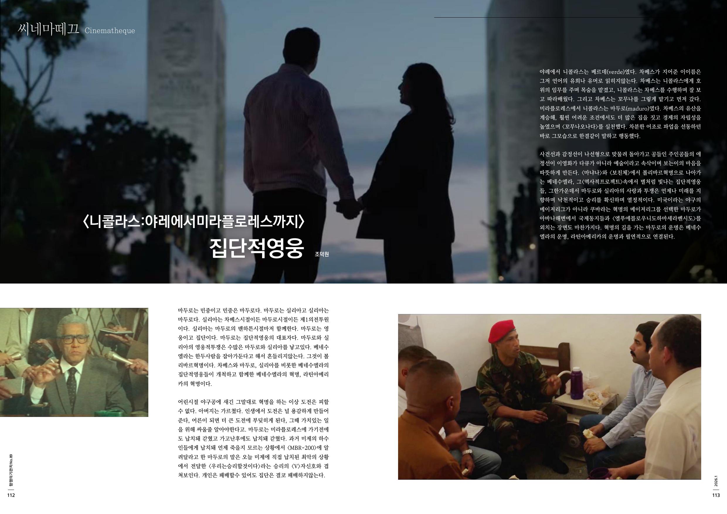 사건선과 감정선이 나선형으로 맞물려 돌아가고 공들인 주인공들의 애정선이 이영화가 다큐가 아니라 예술이라고 속삭이며 보는이의 마음을 따뜻하게 만든다. <마냐나>와 <보친체>에서 볼리바르혁명으로 나아가는 베네수엘라, 그<역사적프로젝트>속에서 별처럼 빛나는 집단적영웅들, 그한가운데서 마두로와 실리아의 사랑과 투쟁은 언제나 미래를 지향하며 낙천적이고 승리를 확신하며 열정적이다. 미국이라는 야구의 메이저리그가 아니라 쿠바라는 혁명의 메이저리그를 선택한 마두로가 아바나해변에서 국제동지들과 <엘푸에블로우니도하마세라벤시도>를 외치는 장면도 마찬가지다. 혁명의 길을 가는 마두로의 운명은 베네수엘라의 운명, 라틴아메리카의 운명과 필연적으로 연결된다.