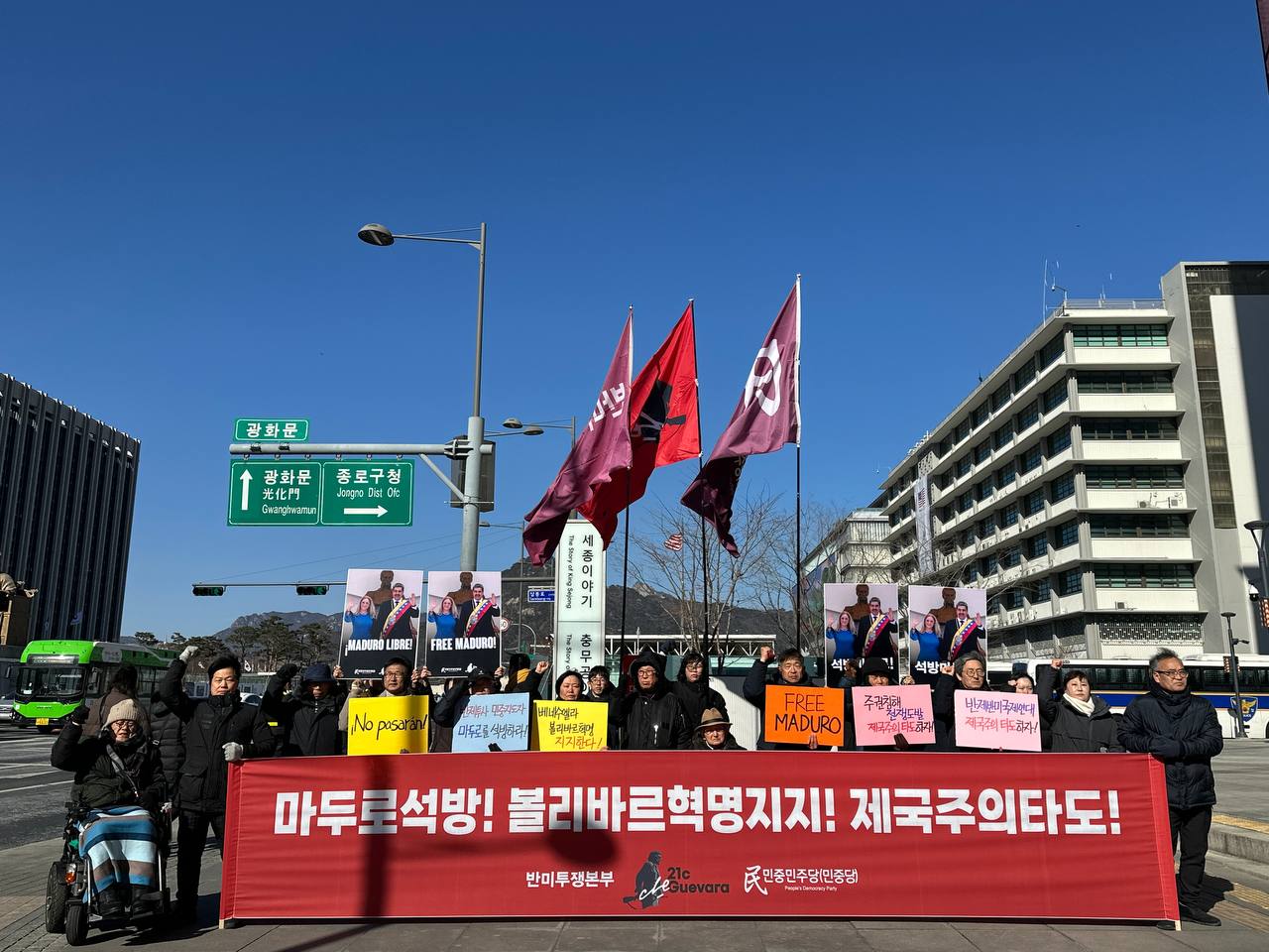 7일 반미투쟁본부·21세기체게바라(Defense Brigade)·민중민주당(민중당)은 미대사관앞에서 <마두로석방! 볼리바르혁명지지! 제국주의타도!> 반제반파쇼정당연설회를 진행했다.