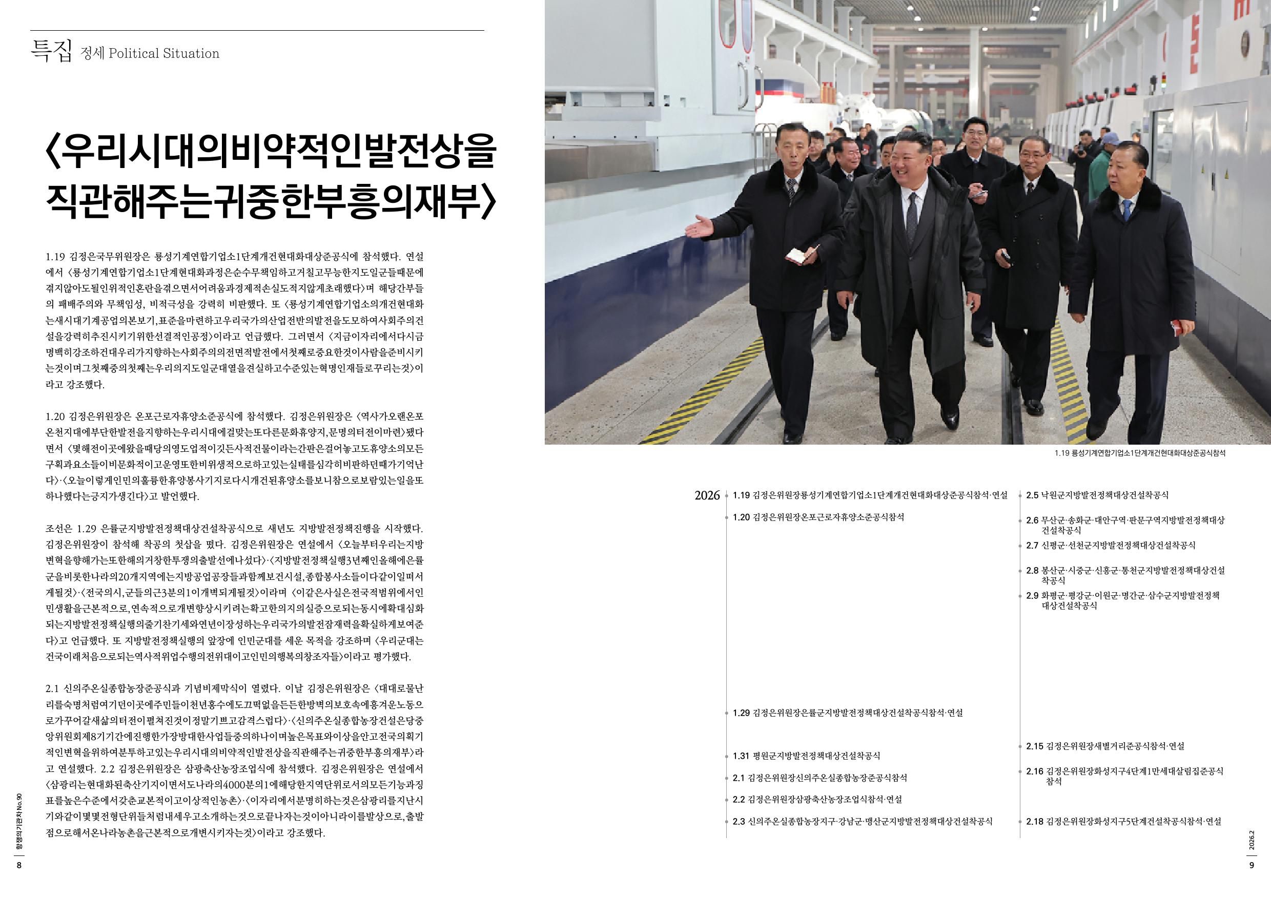 1.19 김정은국무위원장은 룡성기계연합기업소1단계개건현대화대상준공식에 참석했다. 연설에서 <룡성기계연합기업소1단계현대화과정은순수무책임하고거칠고무능한지도일군들때문에겪지않아도될인위적인혼란을겪으면서어려움과경제적손실도적지않게초래했다>며 해당간부들의 패배주의와 무책임성, 비적극성을 강력히 비판했다. 또 <룡성기계연합기업소의개건현대화는새시대기계공업의본보기,표준을마련하고우리국가의산업전반의발전을도모하여사회주의건설을강력히추진시키기위한선결적인공정>이라고 언급했다. 그러면서 <지금이자리에서다시금명백히강조하건대우리가지향하는사회주의의전면적발전에서첫째로중요한것이사람을준비시키는것이며그첫째중의첫째는우리의지도일군대열을견실하고수준있는혁명인재들로꾸리는것>이라고 강조했다.