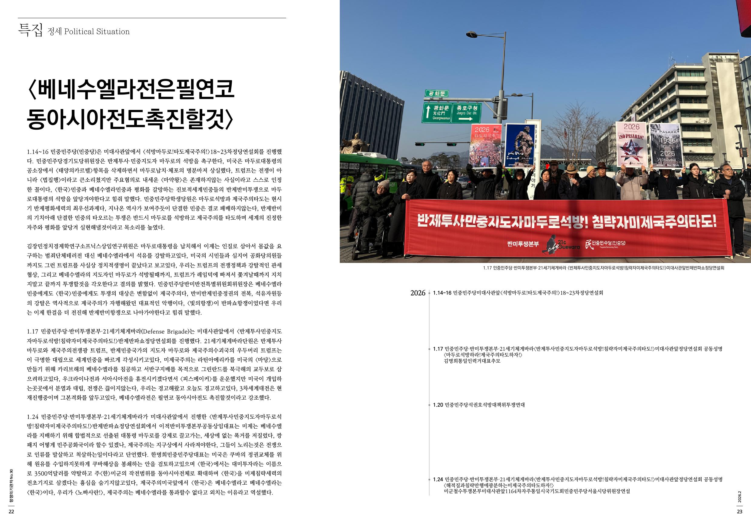 1.17 민중민주당·반미투쟁본부·21세기체게바라(Defense Brigade)는 미대사관앞에서 <반제투사민중지도자마두로석방!침략자미제국주의타도!>반제반파쇼정당연설회를 진행했다. 21세기체게바라단원은 반제투사 마두로와 제국주의전쟁광 트럼프, 반제민중국가의 지도자 마두로와 제국주의수괴국의 우두머리 트럼프는 이 극명한 대립으로 세계민중을 빠르게 각성시키고있다, 미제국주의는 라틴아메리카를 미국의 <마당>으로 만들기 위해 카리브해의 베네수엘라를 침공하고 서반구지배를 목적으로 그린란드를 북극해의 교두보로 삼으려하고있다, 우크라이나전과 서아시아전을 휴전시키겠다면서 <피스메이커>를 운운했지만 미국이 개입하는곳곳에서 분열과 대립, 전쟁은 끊이지않는다, 우리는 경고해왔고 오늘도 경고하고있다, 3차세계대전은 현재진행중이며 그본격화를 앞두고있다, 베네수엘라전은 필연코 동아시아전도 촉진할것이라고 강조했다.