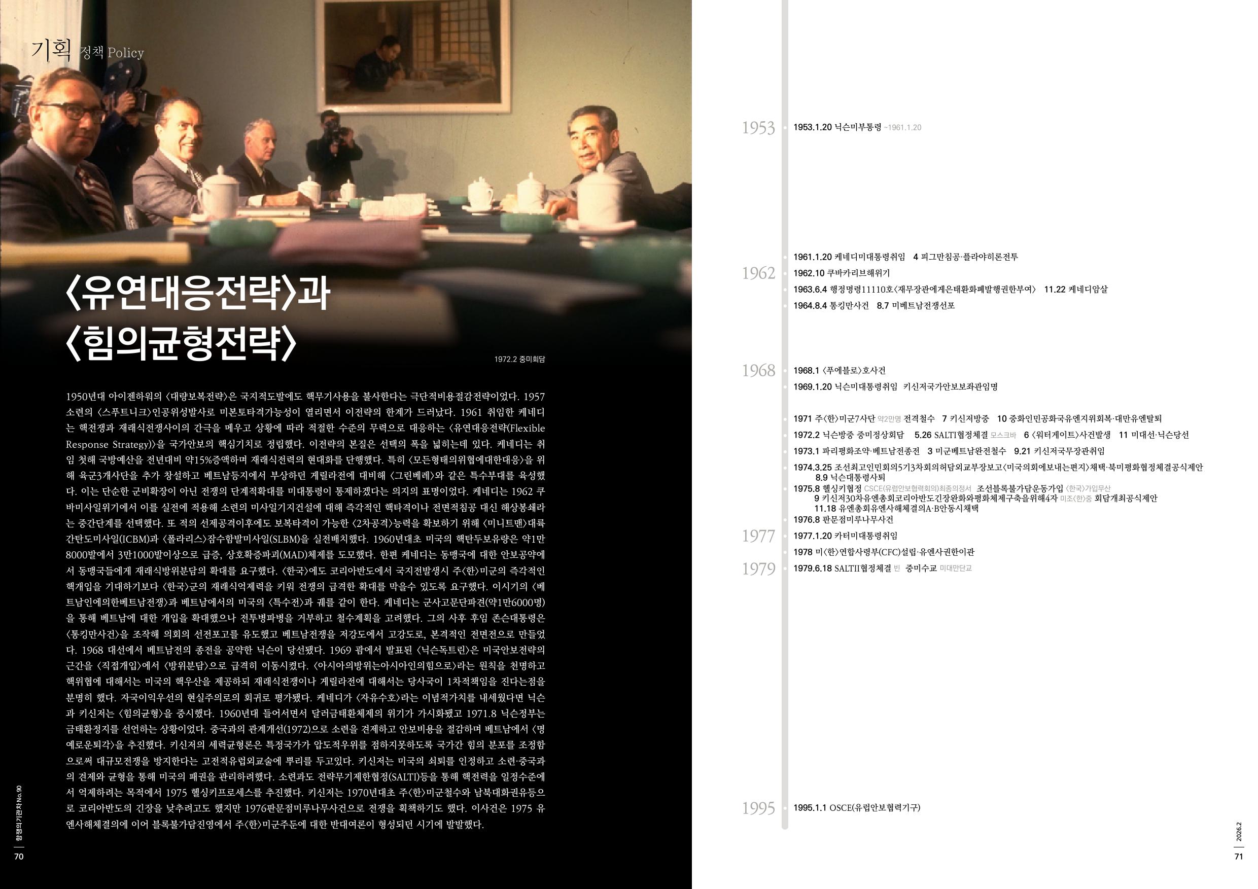 1950년대 아이젠하워의 <대량보복전략>은 국지적도발에도 핵무기사용을 불사한다는 극단적비용절감전략이었다. 1957 소련의 <스푸트니크>인공위성발사로 미본토타격가능성이 열리면서 이전략의 한계가 드러났다. 1961 취임한 케네디는 핵전쟁과 재래식전쟁사이의 간극을 메우고 상황에 따라 적절한 수준의 무력으로 대응하는 <유연대응전략(Flexible Response Strategy)>을 국가안보의 핵심기치로 정립했다. 이전략의 본질은 선택의 폭을 넓히는데 있다. 케네디는 취임 첫해 국방예산을 전년대비 약15%증액하며 재래식전력의 현대화를 단행했다. 특히 <모든형태의위협에대한대응>을 위해 육군3개사단을 추가 창설하고 베트남등지에서 부상하던 게릴라전에 대비해 <그린베레>와 같은 특수부대를 육성했다. 이는 단순한 군비확장이 아닌 전쟁의 단계적확대를 미대통령이 통제하겠다는 의지의 표명이었다. 케네디는 1962 쿠바미사일위기에서 이를 실전에 적용해 소련의 미사일기지건설에 대해 즉각적인 핵타격이나 전면적침공 대신 해상봉쇄라는 중간단계를 선택했다. 또 적의 선제공격이후에도 보복타격이 가능한 <2차공격>능력을 확보하기 위해 <미니트맨>대륙간탄도미사일(ICBM)과 <폴라리스>잠수함발미사일(SLBM)을 실전배치했다. 1960년대초 미국의 핵탄두보유량은 약1만8000발에서 3만1000발이상으로 급증, 상호확증파괴(MAD)체제를 도모했다. 한편 케네디는 동맹국에 대한 안보공약에서 동맹국들에게 재래식방위분담의 확대를 요구했다. <한국>에도 코리아반도에서 국지전발생시 주<한>미군의 즉각적인 핵개입을 기대하기보다 <한국>군의 재래식억제력을 키워 전쟁의 급격한 확대를 막을수 있도록 요구했다. 이시기의 <베트남인에의한베트남전쟁>과 베트남에서의 미국의 <특수전>과 궤를 같이 한다. 케네디는 군사고문단파견(약1만6000명)을 통해 베트남에 대한 개입을 확대했으나 전투병파병을 거부하고 철수계획을 고려했다. 그의 사후 후임 존슨대통령은 <통킹만사건>을 조작해 의회의 선전포고를 유도했고 베트남전쟁을 저강도에서 고강도로, 본격적인 전면전으로 만들었다. 1968 대선에서 베트남전의 종전을 공약한 닉슨이 당선됐다. 1969 괌에서 발표된 <닉슨독트린>은 미국안보전략의 근간을 <직접개입>에서 <방위분담>으로 급격히 이동시켰다. <아시아의방위는아시아인의힘으로>라는 원칙을 천명하고 핵위협에 대해서는 미국의 핵우산을 제공하되 재래식전쟁이나 게릴라전에 대해서는 당사국이 1차적책임을 진다는점을 분명히 했다. 자국이익우선의 현실주의로의 회귀로 평가됐다. 케네디가 <자유수호>라는 이념적가치를 내세웠다면 닉슨과 키신저는 <힘의균형>을 중시했다. 1960년대 들어서면서 달러금태환체제의 위기가 가시화됐고 1971.8 닉슨정부는 금태환정지를 선언하는 상황이었다. 중국과의 관계개선(1972)으로 소련을 견제하고 안보비용을 절감하며 베트남에서 <명예로운퇴각>을 추진했다. 키신저의 세력균형론은 특정국가가 압도적우위를 점하지못하도록 국가간 힘의 분포를 조정함으로써 대규모전쟁을 방지한다는 고전적유럽외교술에 뿌리를 두고있다. 키신저는 미국의 쇠퇴를 인정하고 소련·중국과의 견제와 균형을 통해 미국의 패권을 관리하려했다. 소련과도 전략무기제한협정(SALTI)등을 통해 핵전력을 일정수준에서 억제하려는 목적에서 1975 헬싱키프로세스를 추진했다. 키신저는 1970년대초 주<한>미군철수와 남북대화권유등으로 코리아반도의 긴장을 낮추려고도 했지만 1976판문점미루나무사건으로 전쟁을 획책하기도 했다. 이사건은 1975 유엔사해체결의에 이어 블록불가담진영에서 주<한>미군주둔에 대한 반대여론이 형성되던 시기에 발발했다.