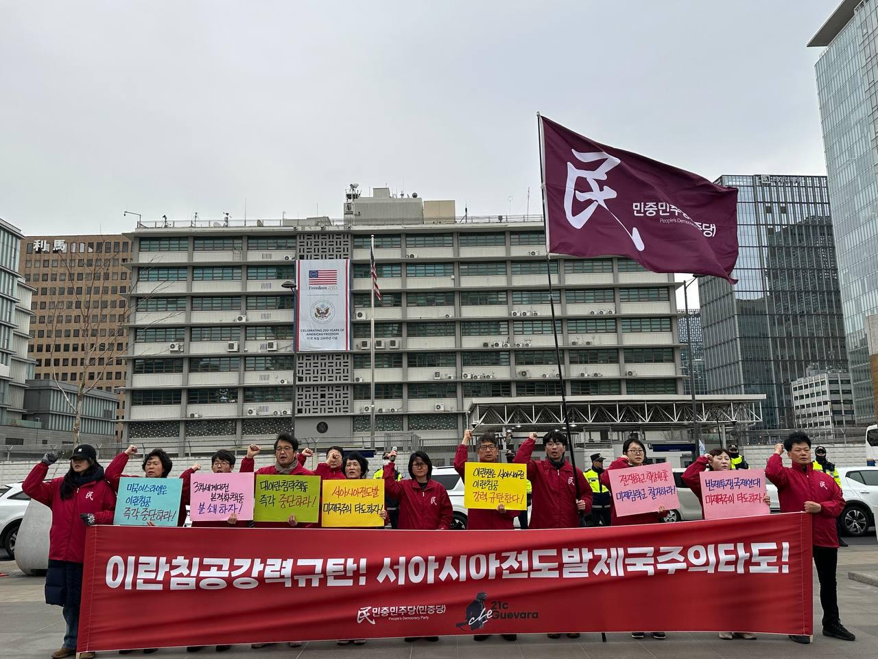 1일 민중민주당(민중당)은 미대사관앞에서 <이란침공강력규탄! 서아시아전도발제국주의타도!> 7차정당연설회를 진행했다.