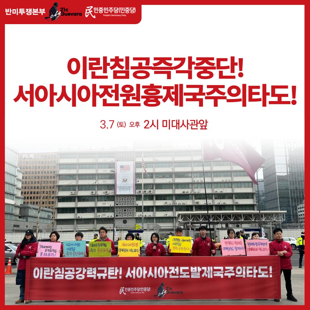 3.1일 16시 미대사관앞 〈이란침공강력규탄! 서아시아전도발제국주의타도!〉정당연설회
