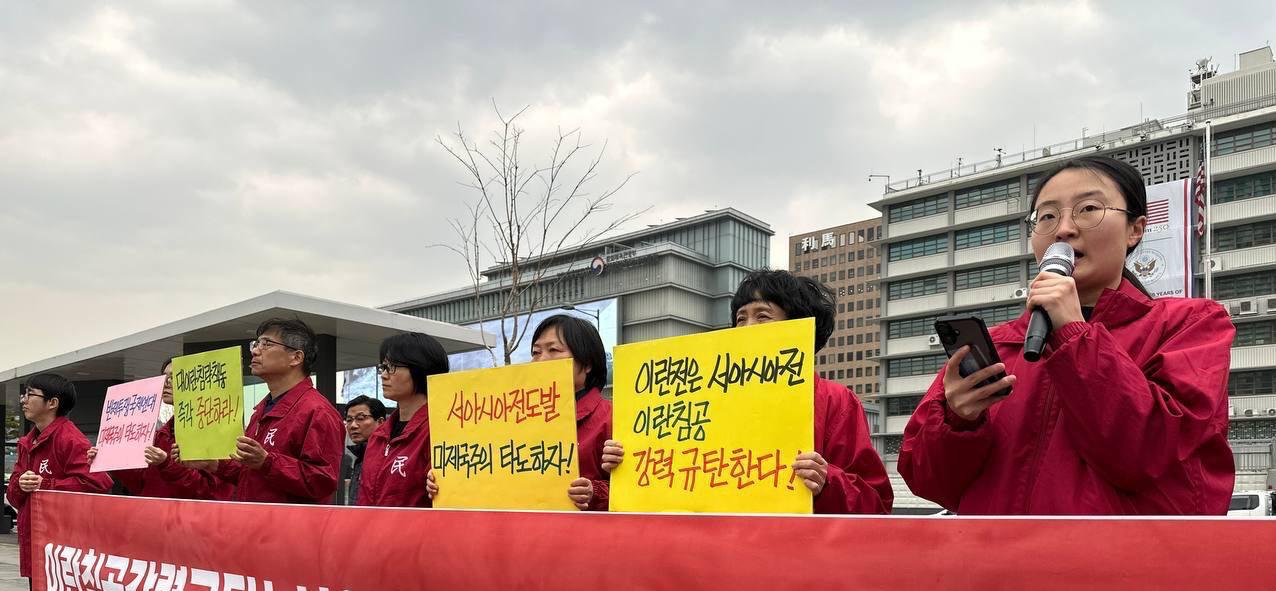 민중민주당청년학생당원은 <2022년 우크라이나전으로 시작된 3차세계대전의 불길은 2023년 팔레스타인을 넘어, 이제 서아시아의 전면전이라는 거대한 화염으로 번지고 있다. 미국과 이스라엘 시오니스트들이 공모하여 벌이는 이 전쟁은 명백한 주권침해이자, 국제법을 유린한 반인륜적 학살극이다. 미제국주의의 침략수법은 실로 비열하고 잔인하다. 미국은 공격시작 단 이틀만에 수만발의 미사일을 이란전역에 퍼부었다. 1000곳이 넘는 주요도시를 타격했으며, 트럼프정부는 이란지도자48명을 한방에 제거했다며 살인을 무용담처럼 떠들고 있다.>고 규탄했다.