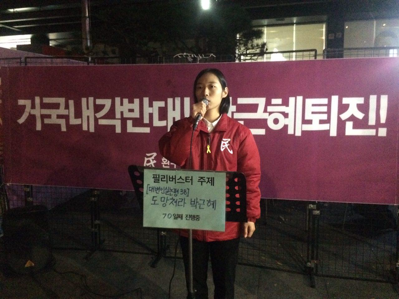 2. 박<대통령>에 대한 격앙된 민심은 자유발언대를 통해 가감없이 터져나왔다. <이젠 어른이 무섭다>는 중학생은 <박수칠 때 떠나라는 말이 있는데, 박근혜에게는 아무도 박수치지 않는다.>며 <도망치세요>라고 주문했다. <퇴진은 맞지 않다. 감옥에 집어넣어야 한다.>는 발언은 큰 박수를 받았다. 박근혜의 최대업적은 반박근혜기치아래 온민을 하나로 뭉치게 한 <국민대통합>이라 할 수 있을정도다.