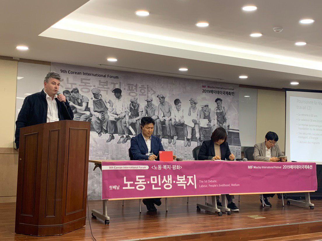 코리아국제포럼 첫째날 주제 <노동·민생·복지>의 보조발제 두 번째 순서로 소르본대 21세기맑스컨퍼런스조직위원이자 진보출판사 델가(Delga)대표인 에므릭몽빌이 발제에 나섰다.