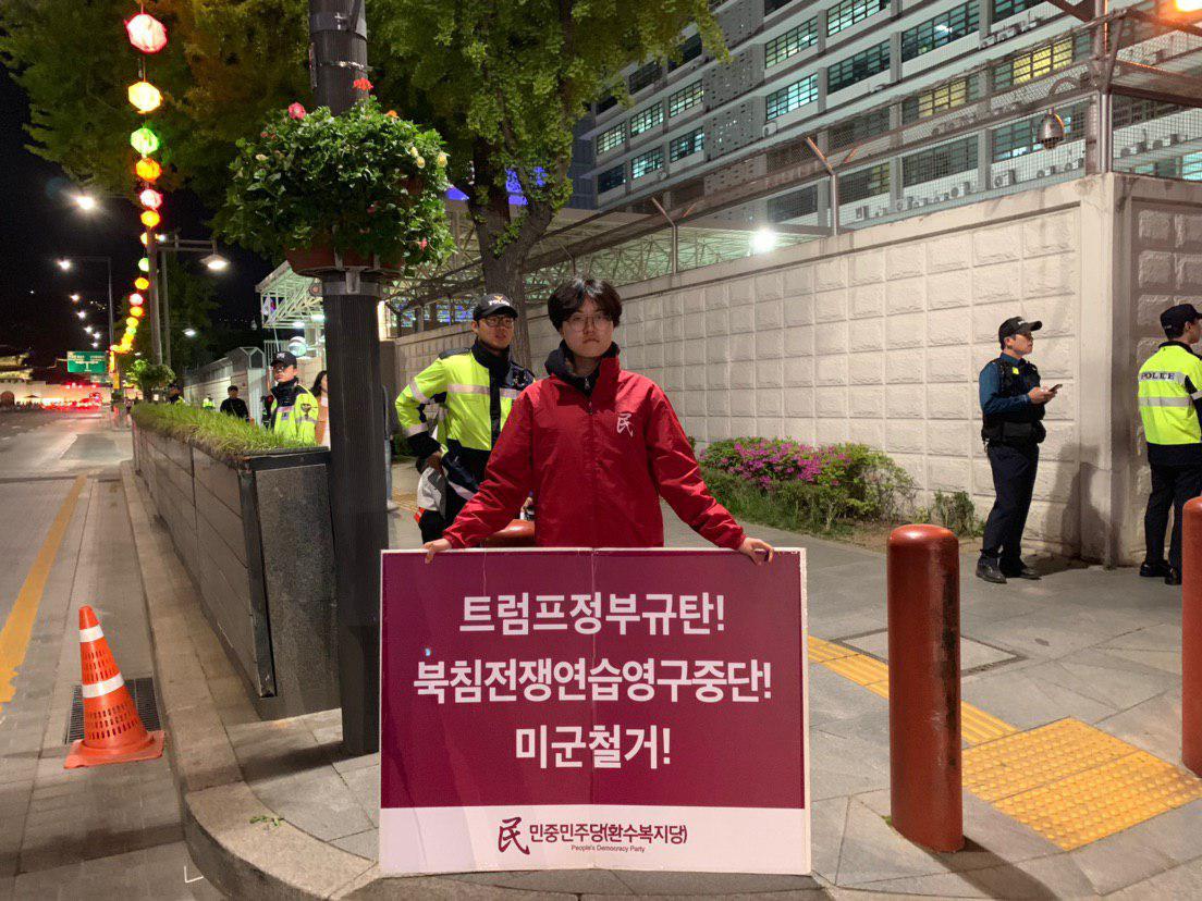 민중민주당(환수복지당)은 5일 미대사관앞에서 <트럼프정부규탄! 북침핵전쟁연습영구중단! 미군철거!>를 촉구하는 피시를 들고 1020일째 평화시위를 이어갔다.