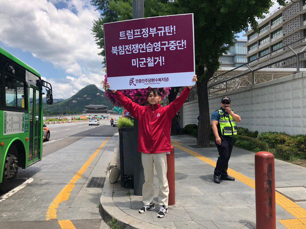 실천民평화시위 민중민주당, 미대사관평화시위 모음(6.16~6.20 1066일째) 2019년 6월 20일 FacebookTwitter 민중민주당(환수복지당)은 20일 밤 미대사관앞에서 <트럼프정부규탄! 북침핵전쟁연습영구중단! 미군철거!>를 촉구하는 피시를 들고 1066일째 평화시위를 이어갔다.