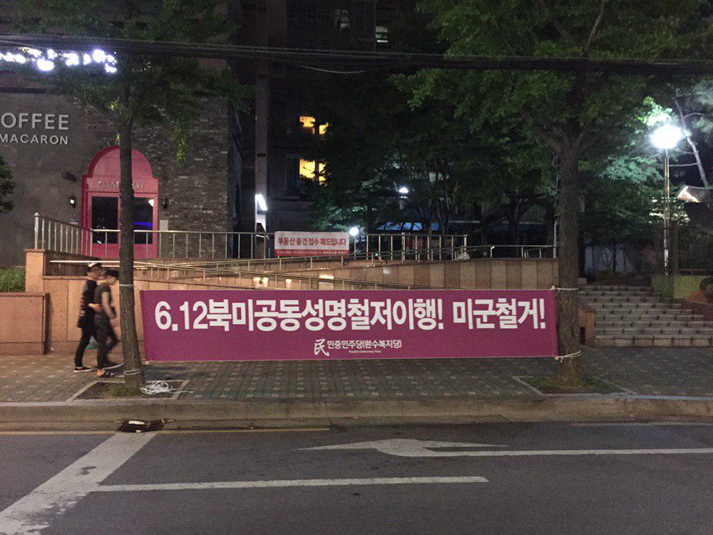 우리당은 30일에도 서울광화문일대와 미대사관 노천당사, 정부서울청사 실업유니온농성장 그리고 동대입구역·장충단공원·장충체육관·을지로4가·을지로2가·종로구청입구사거리·연희동·연희삼거리·홍대입구역·이대역·신촌로터리·신촌역주변에 <6.12북미공동성명철저이행! 미군철거!>·<코리아반도평화체제수립! 미군철거!>·<내정간섭중단! 비핵화워킹그룹해체!>·<외세배격! 민족공조! 남북공동선언이행!> 가로막 44개를 29일부터 추가설치했습니다!