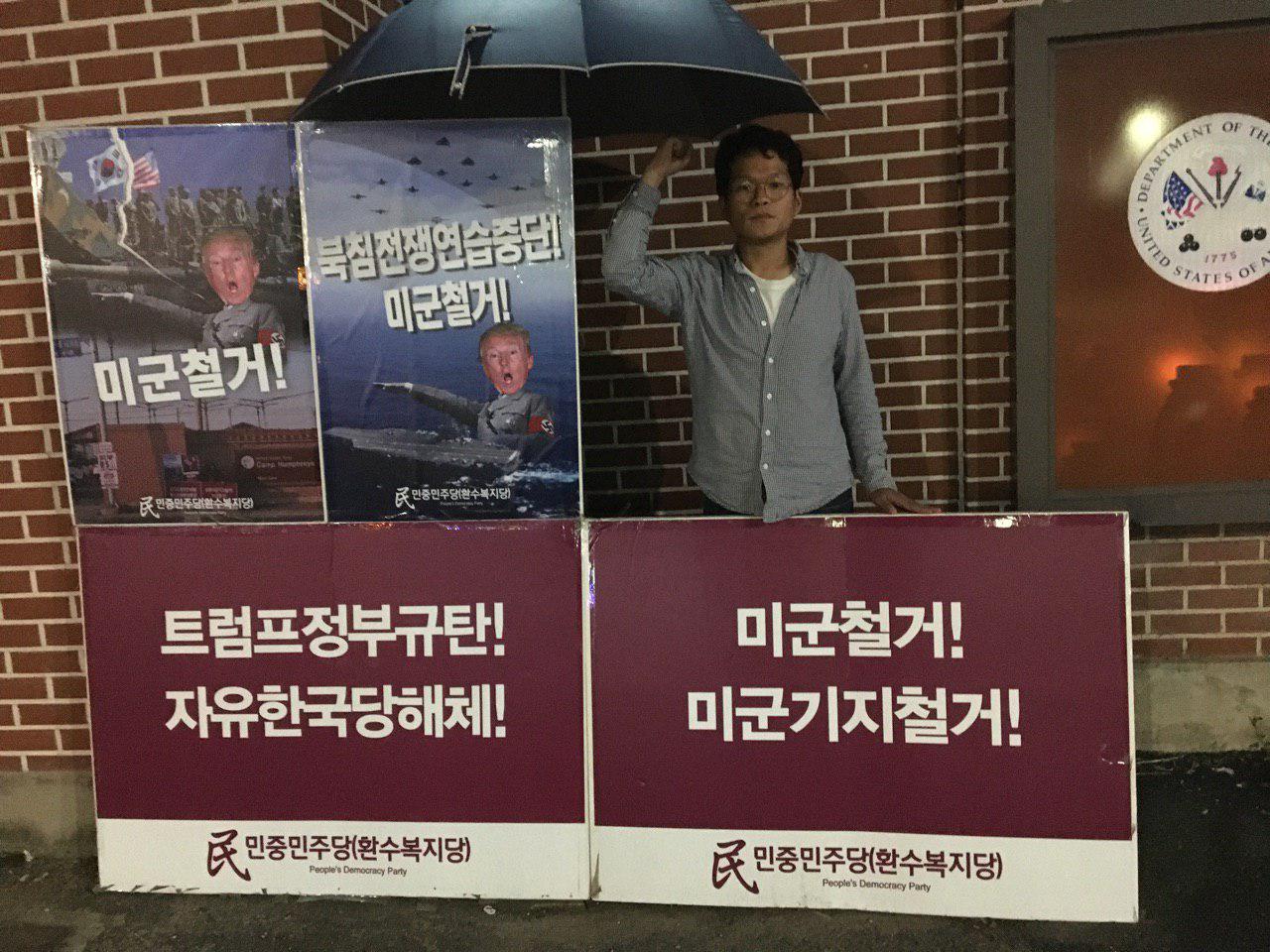실천民평화시위 민중민주당, 평택캠프험프리스앞 철야시위 (6.26~6.30 181일째) 2019년 6월 30일 FacebookTwitter 우리당은 1월1일 0시부터 경기도 평택캠프험프리스 정문에서<트럼프정부규탄! 자유한국당해체!>, <모든미군기지철거! 미군철거!> 철야시위를 시작했습니다! 6월30일 현재 181일째 전개중입니다. 2019년을 미군철거원년의 해로 만들겠다는 의지를 담아 주남미군철거투쟁의 최전선인 캠프험프리스앞에서 우리당원들이 투쟁하고있습니다!