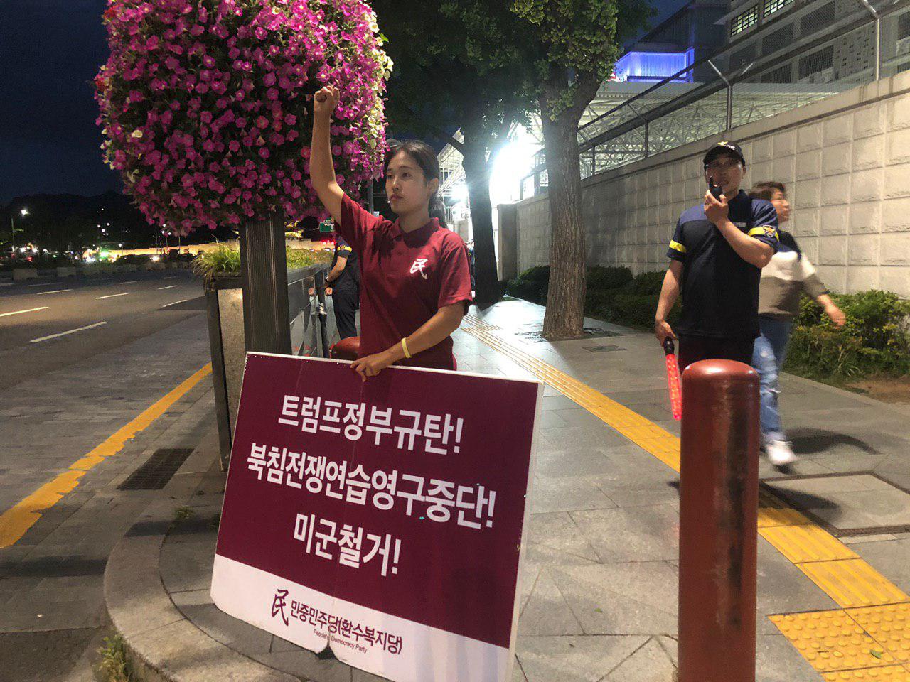 실천民평화시위 민중민주당, 미대사관평화시위 모음(7.16~7.20 1096일째) 2019년 7월 20일 FacebookTwitter 민중민주당(환수복지당)은 20일 미대사관앞에서 <트럼프정부규탄! 북침핵전쟁연습영구중단! 미군철거!>를 촉구하는 피시를 들고 1096일째 평화시위를 이어갔다.
