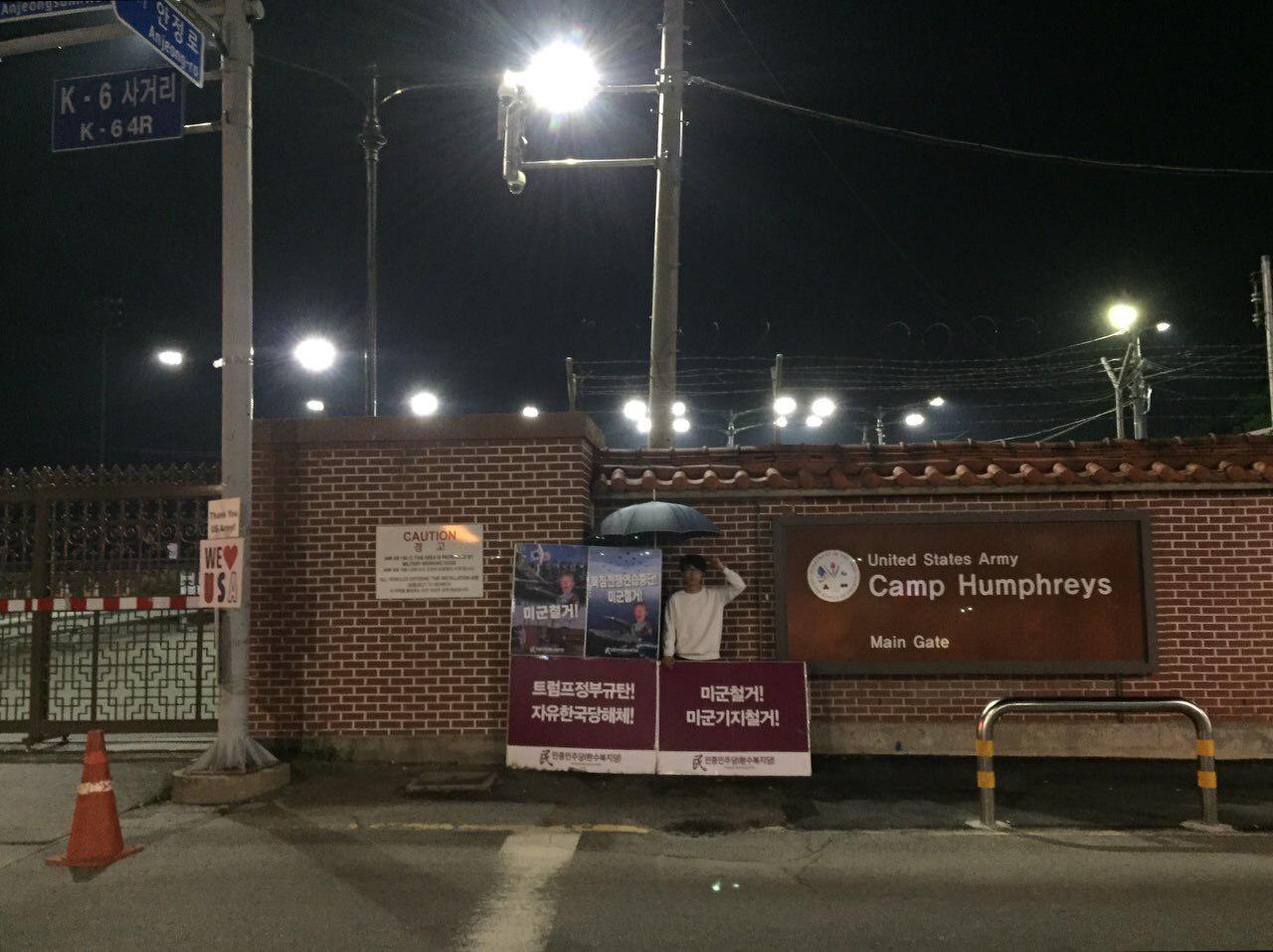 실천民평화시위 민중민주당, 평택캠프험프리스앞 철야시위 (7.31~8.4 216일째) 2019년 8월 4일 FacebookTwitter 우리당은 1월1일 0시부터 경기도 평택캠프험프리스 정문에서<트럼프정부규탄! 자유한국당해체!>, <모든미군기지철거! 미군철거!> 철야시위를 시작했습니다! 8월4일 현재 216일째 전개중입니다. 2019년을 미군철거원년의 해로 만들겠다는 의지를 담아 주남미군철거투쟁의 최전선인 캠프험프리스앞에서 우리당원들이 투쟁하고있습니다!