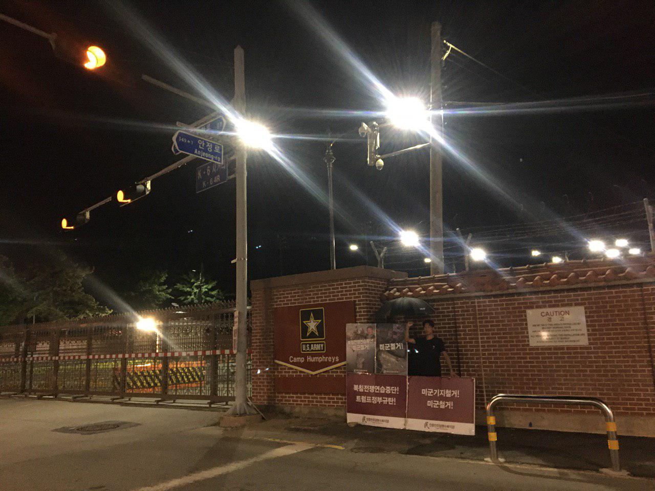 실천民평화시위 민중민주당, 평택캠프험프리스앞 철야시위 (8.26~8.31 243일째) 2019년 9월 1일 FacebookTwitter 우리당은 1월1일 0시부터 경기도 평택캠프험프리스 정문에서<트럼프정부규탄! 자유한국당해체!>, <모든미군기지철거! 미군철거!> 철야시위를 시작했습니다! 8월31일 현재 243일째 전개중입니다. 2019년을 미군철거원년의 해로 만들겠다는 의지를 담아 주남미군철거투쟁의 최전선인 캠프험프리스앞에서 우리당원들이 투쟁하고있습니다!
