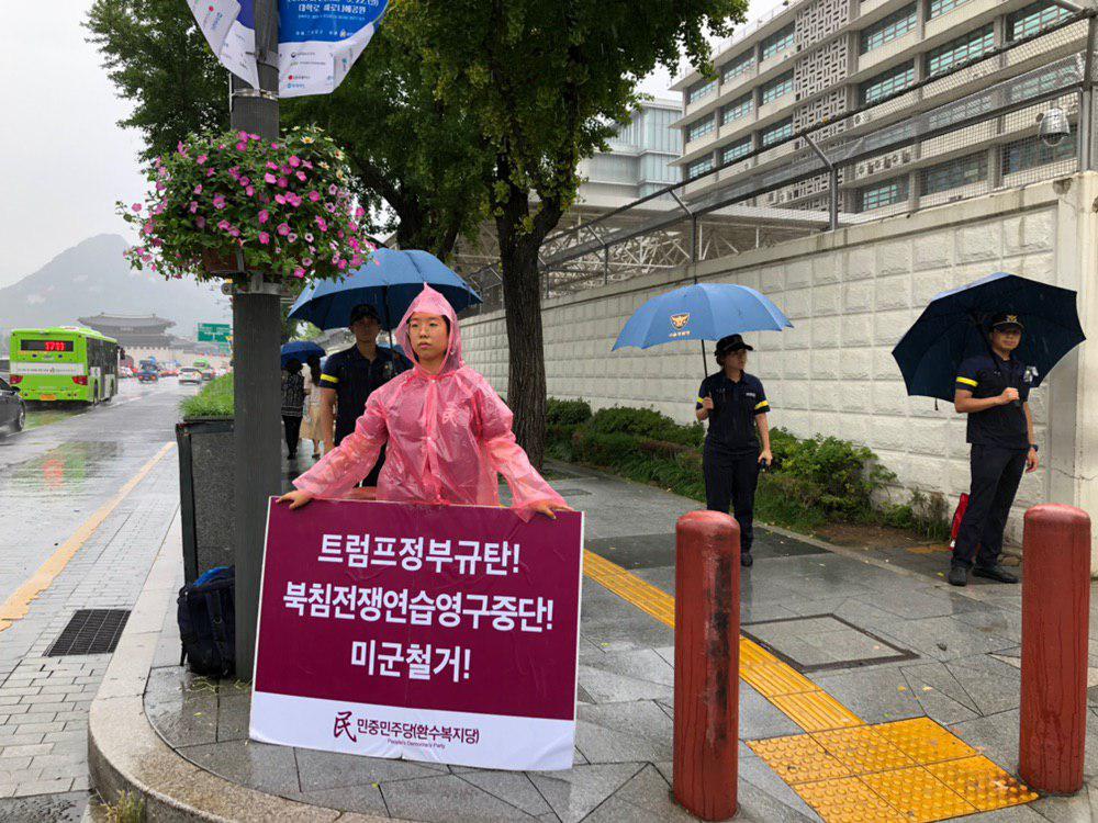 실천民평화시위 민중민주당, 미대사관평화시위 모음(9.6~9.10 1148일째) 2019년 9월 10일 FacebookTwitter 민중민주당(환수복지당)은 10일 미대사관앞에서 <트럼프정부규탄! 북침핵전쟁연습영구중단! 미군철거!>를 촉구하는 피시를 들고 1148일째 평화시위를 이어갔다.