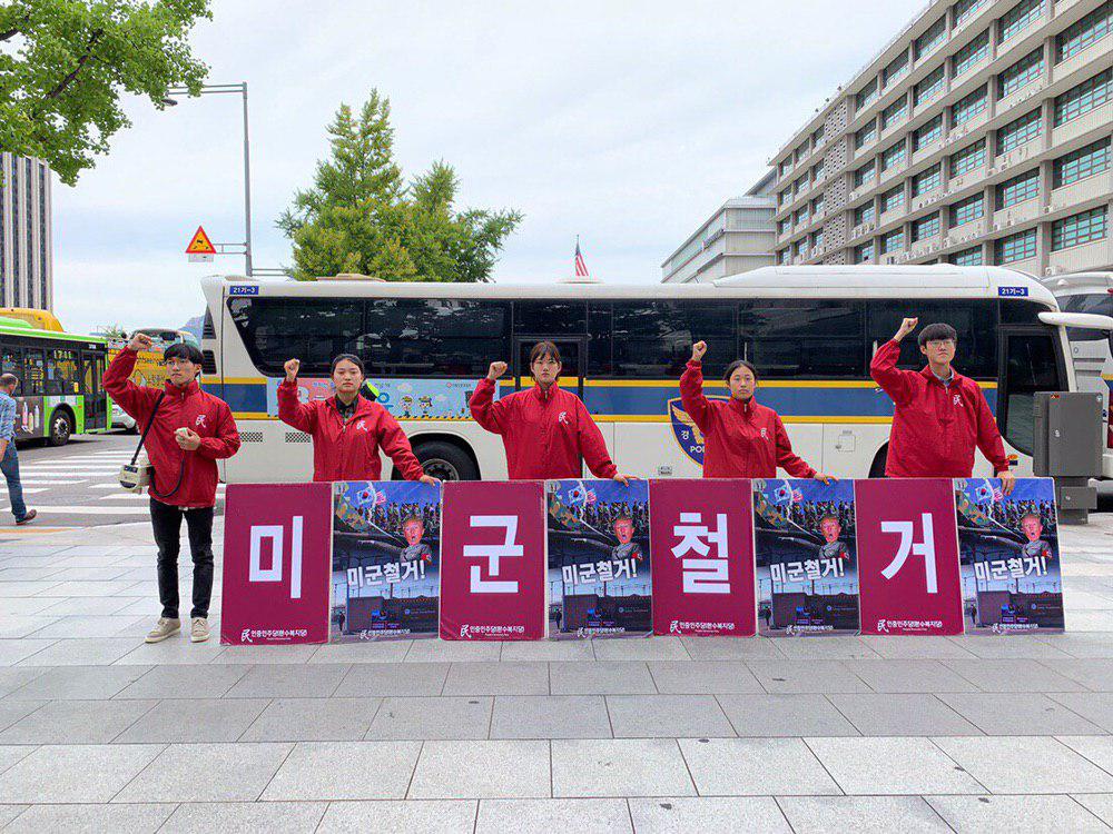 <미>, <군>, <철>, <거> 한글자구호판과 <미군철거!>이미지피씨를 들고 사방1인시위를 진행했습니다.