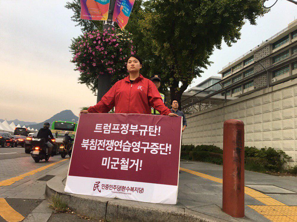실천民평화시위 민중민주당, 미대사관평화시위 모음(9.21~9.25 1163일째) 2019년 9월 25일 FacebookTwitter 민중민주당(환수복지당)은 25일 미대사관앞에서 <트럼프정부규탄! 북침핵전쟁연습영구중단! 미군철거!>를 촉구하는 피시를 들고 1163일째 평화시위를 이어갔다. 나는 사람들은 평화시위를 탄압하는 경찰의 만행에 주목했다.