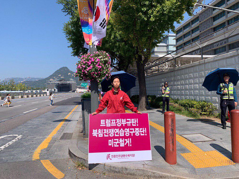 실천民평화시위 민중민주당, 미대사관평화시위 모음(9.26~9.30 1168일째) 2019년 10월 1일 FacebookTwitter 민중민주당(환수복지당)은 30일 미대사관앞에서 <트럼프정부규탄! 북침핵전쟁연습영구중단! 미군철거!>를 촉구하는 피시를 들고 1168일째 평화시위를 이어갔다. 나는 사람들은 평화시위를 탄압하는 경찰의 만행에 주목했다.
