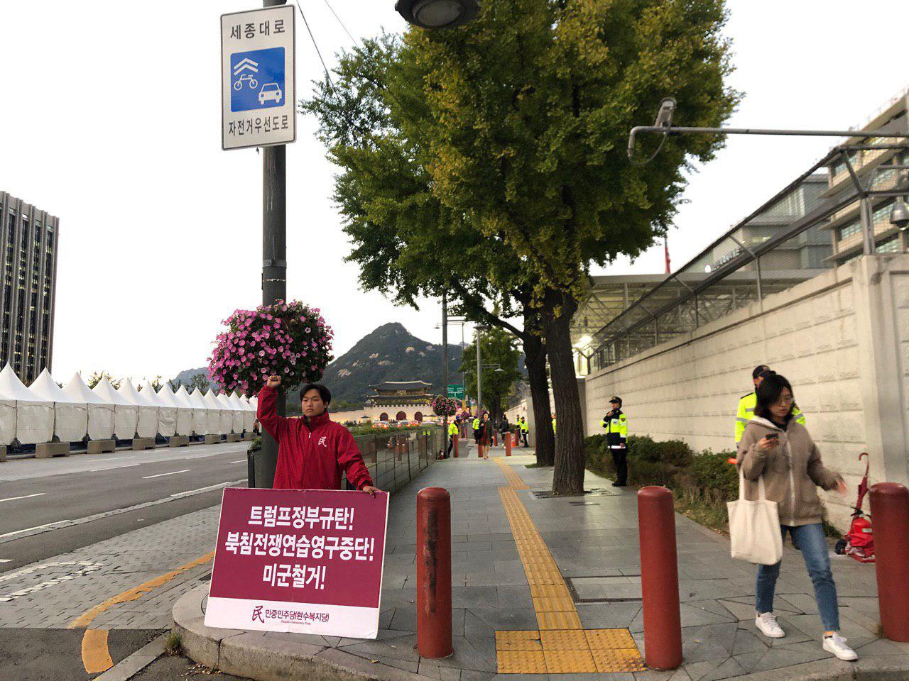 실천民평화시위 민중민주당, 미대사관평화시위 모음(10.11~10.15 1183일째) 2019년 10월 15일 FacebookTwitter 민중민주당(환수복지당)은 15일 미대사관앞에서 <트럼프정부규탄! 북침핵전쟁연습영구중단! 미군철거!>를 촉구하는 피시를 들고 1183일째 평화시위를 이어갔다.