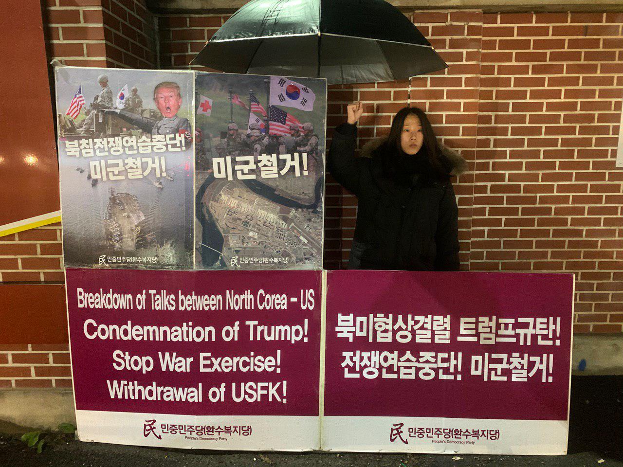 실천民평화시위 민중민주당, 평택캠프험프리스앞 철야시위 (10.26~10.31 304일째) 2019년 10월 31일 FacebookTwitter 우리당은 1월1일 0시부터 경기도 평택캠프험프리스 정문에서<트럼프정부규탄! 자유한국당해체!>, <모든미군기지철거! 미군철거!> 철야시위를 시작했습니다! 10월31일 현재 304일째 전개중입니다. 2019년을 미군철거원년의 해로 만들겠다는 의지를 담아 주남미군철거투쟁의 최전선인 캠프험프리스앞에서 우리당원들이 투쟁하고있습니다!