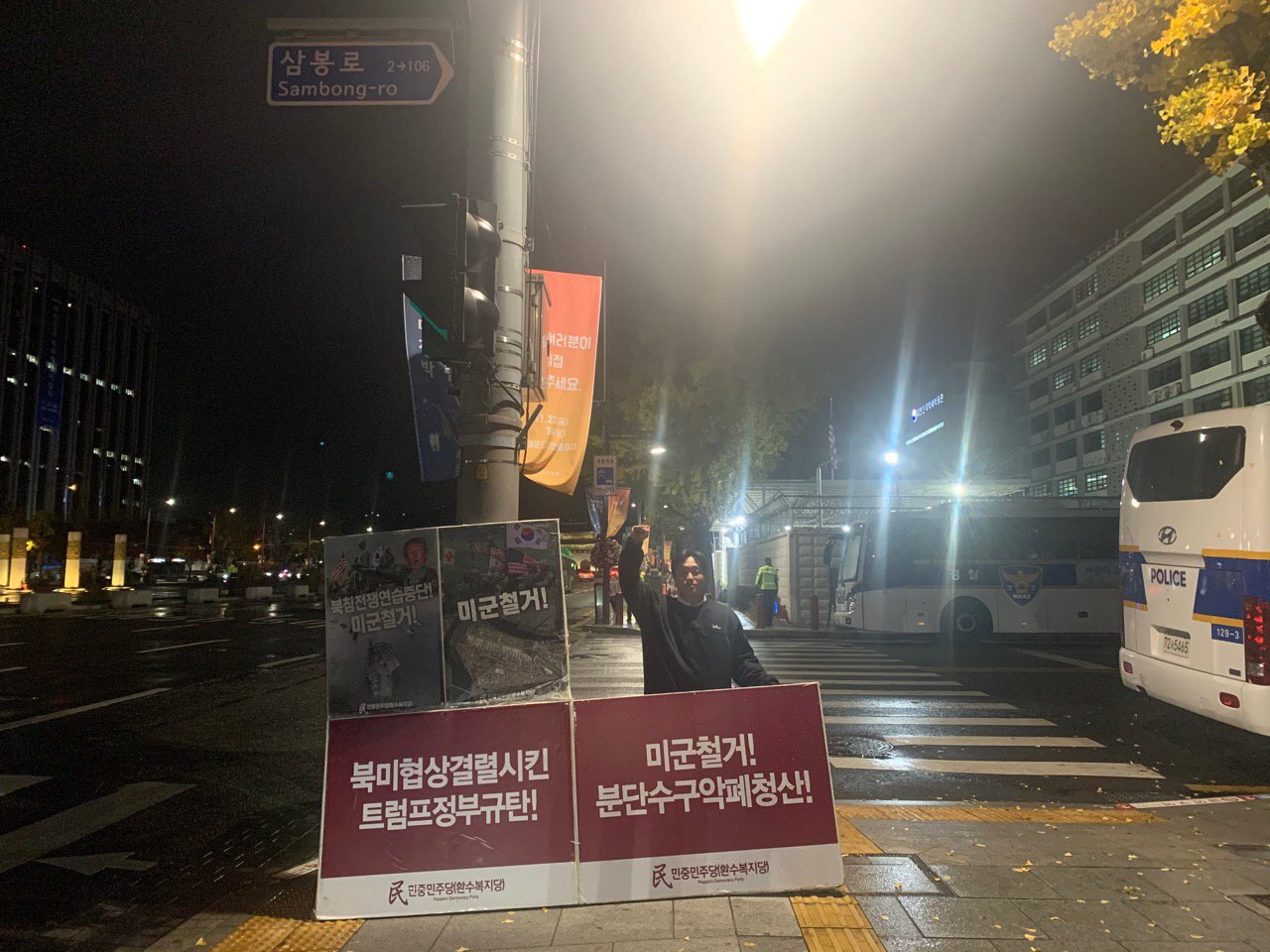 民무기한비상행동실천 민중민주당, 무기한비상행동 모음(11.6~11.10 775일째) 2019년 11월 10일 FacebookTwitter 우리당은 11월10일 서울광화문 미대사관앞에서 <제재반대·평화협상100일행동>과 반전평화·악폐청산을 위한 <무기한 비상행동>을 875일째 전개했습니다. <트럼프정부규탄! 자유한국당해체!>,<북침전쟁연습중단! 미군철거!>를 촉구하며 무기한 비상행동을 전개 중입니다.