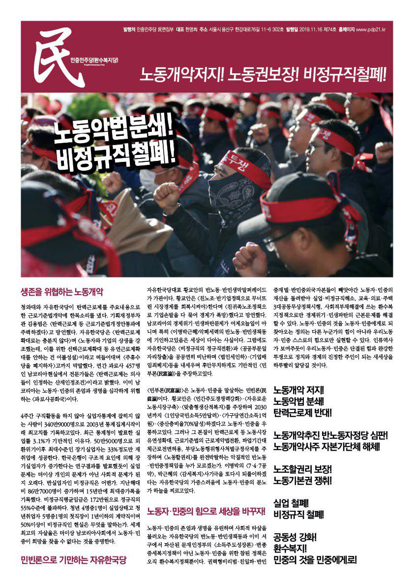 자료당신문<民> 민중민주당 신문民74호 〈노동개악저지! 노동권보장! 비정규직철폐!〉 2019년 11월 16일 FacebookTwitter 민중민주당은 11/16 신문民74호 <노동개악저지! 노동권보장! 비정규직철폐!>를 발행했습니다.