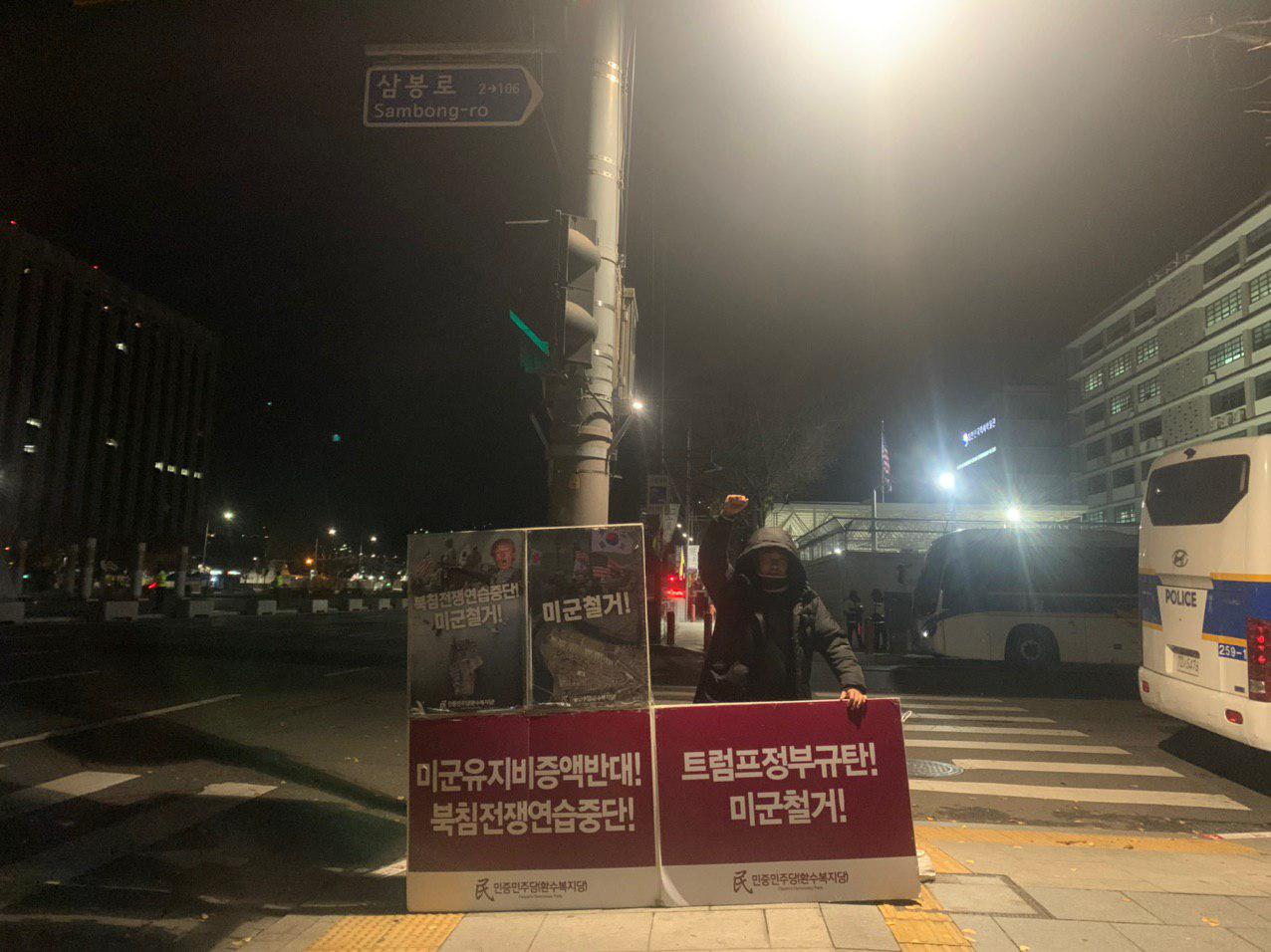 실천民무기한비상행동 민중민주당, 무기한비상행동 모음(11.21~11.25 790일째) 2019년 11월 26일 FacebookTwitter 우리당은 11월25일 서울광화문 미대사관앞에서 <제재반대·평화협상100일행동>과 반전평화·악폐청산을 위한 <무기한 비상행동>을 890일째 전개했습니다. <미군유지비증액반대! 북침전쟁연습중단!>,<트럼프정부규탄! 미군철거!>를 촉구하며 무기한 비상행동을 전개 중입니다.