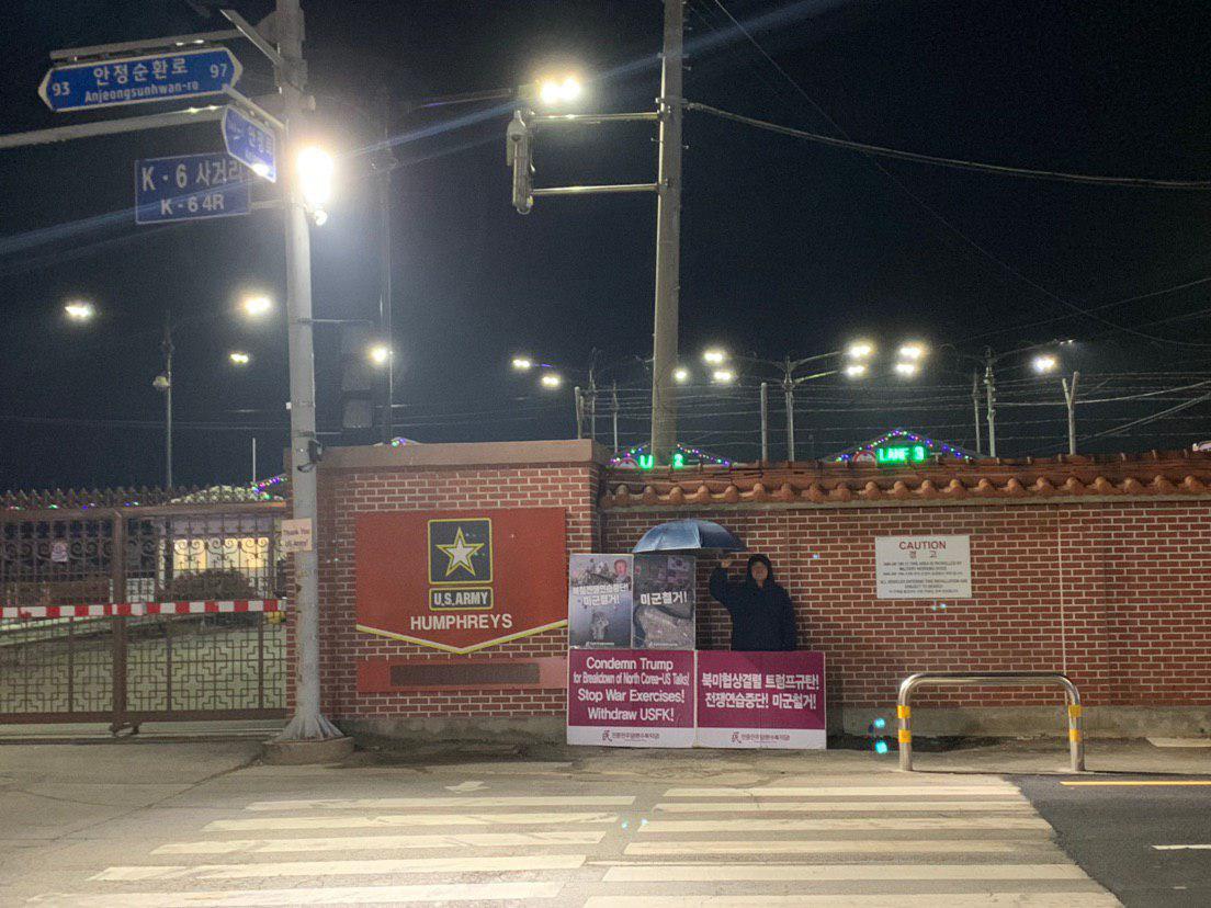 실천民평화시위 민중민주당, 평택캠프험프리스앞 철야시위 (12.16~12.20 354일째) 2019년 12월 21일 FacebookTwitter 우리당은 1월1일 0시부터 경기도 평택캠프험프리스 정문에서<트럼프정부규탄! 자유한국당해체!>, <모든미군기지철거! 미군철거!> 철야시위를 시작했습니다! 12월20일 현재 354일째 전개중입니다. 2019년을 미군철거원년의 해로 만들겠다는 의지를 담아 주남미군철거투쟁의 최전선인 캠프험프리스앞에서 우리당원들이 투쟁하고있습니다!