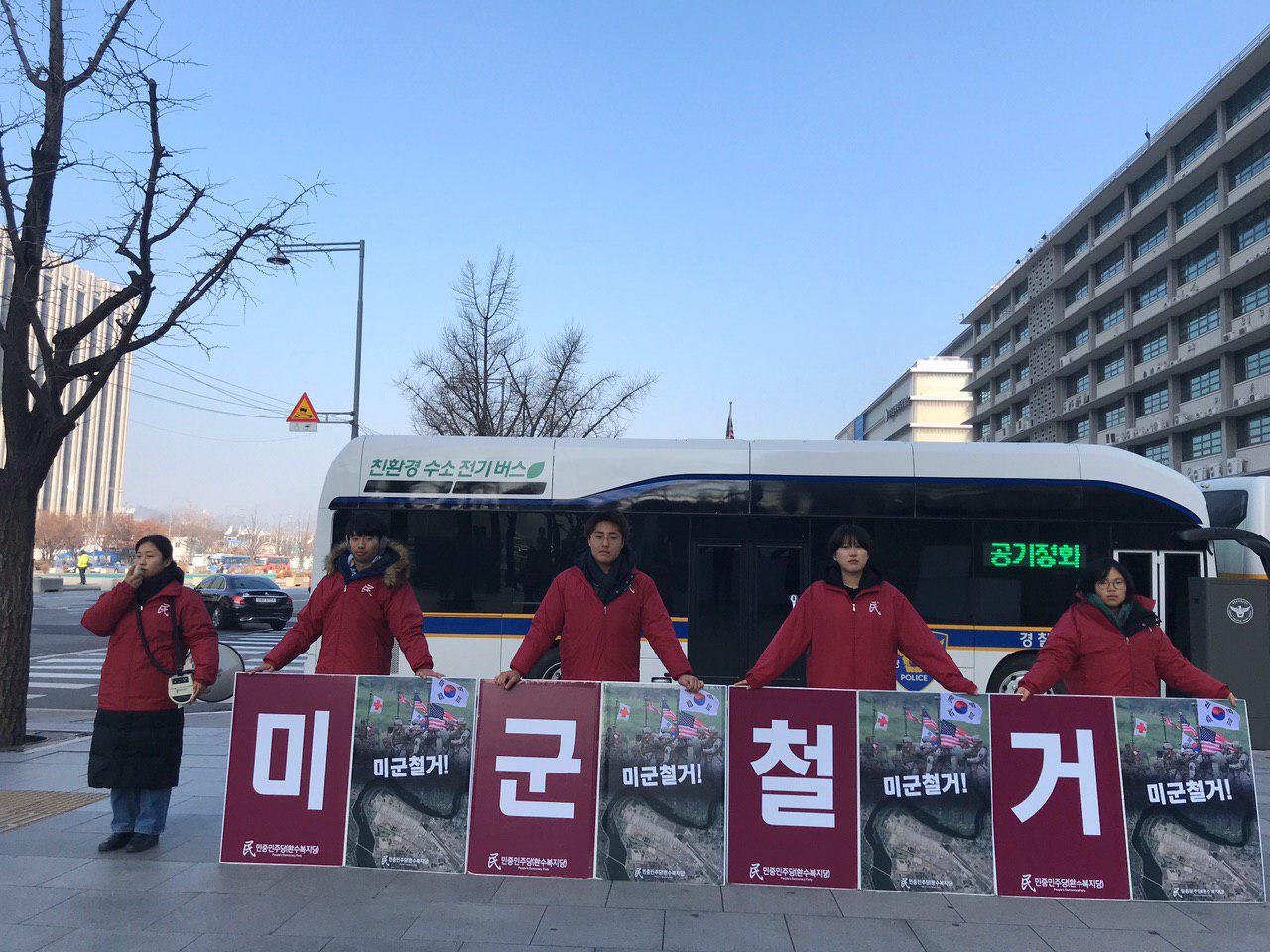 <미군유지비증액반대! 북침전쟁연습중단!>,<트럼프정부규탄! 미군철거!>를 촉구하며 무기한 비상행동을 전개 중입니다.