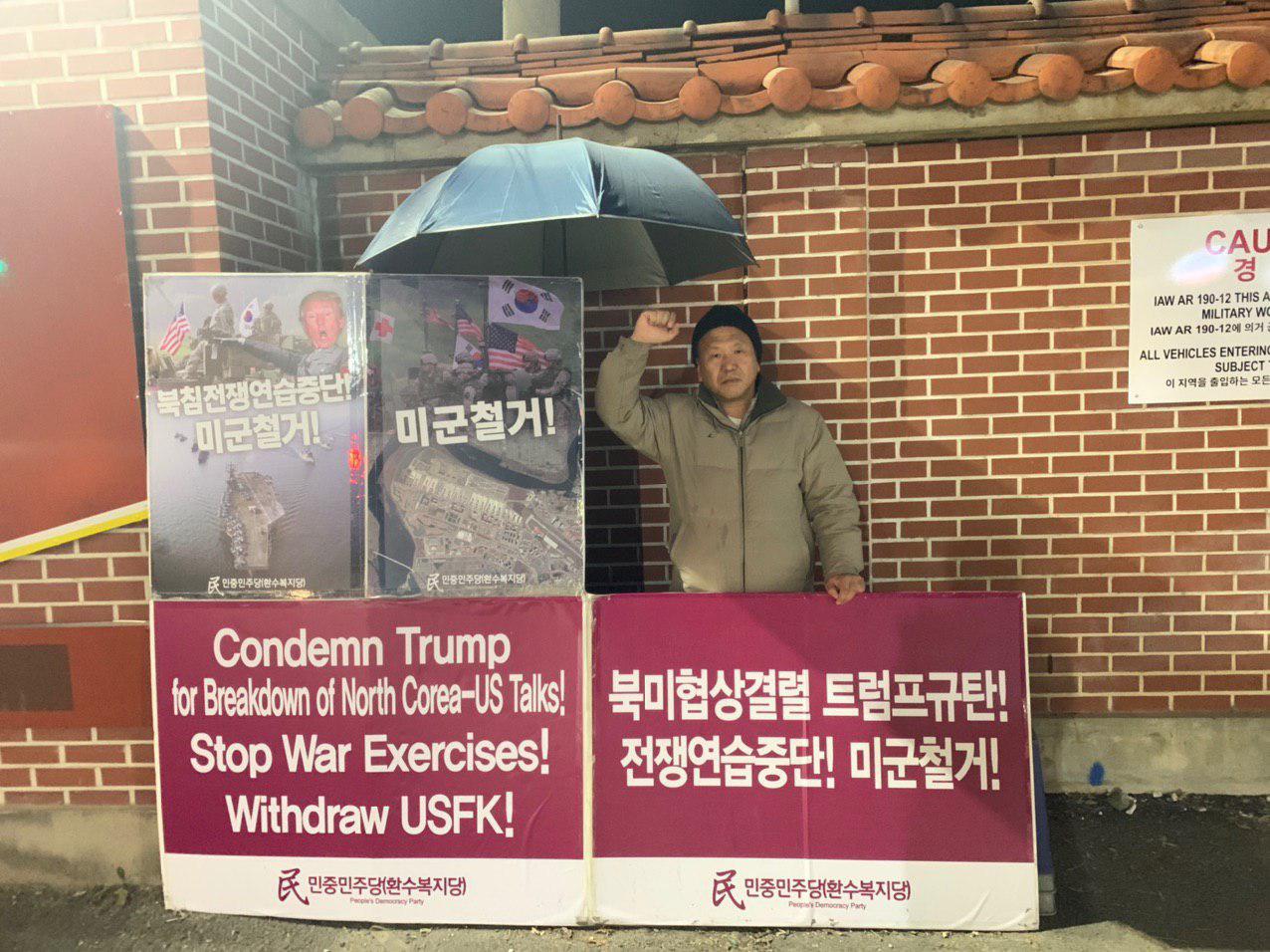 <미군유지비증액반대! 북침전쟁연습중단!>,<트럼프정부규탄! 미군철거!>를 촉구하며 무기한 비상행동을 전개 중입니다.