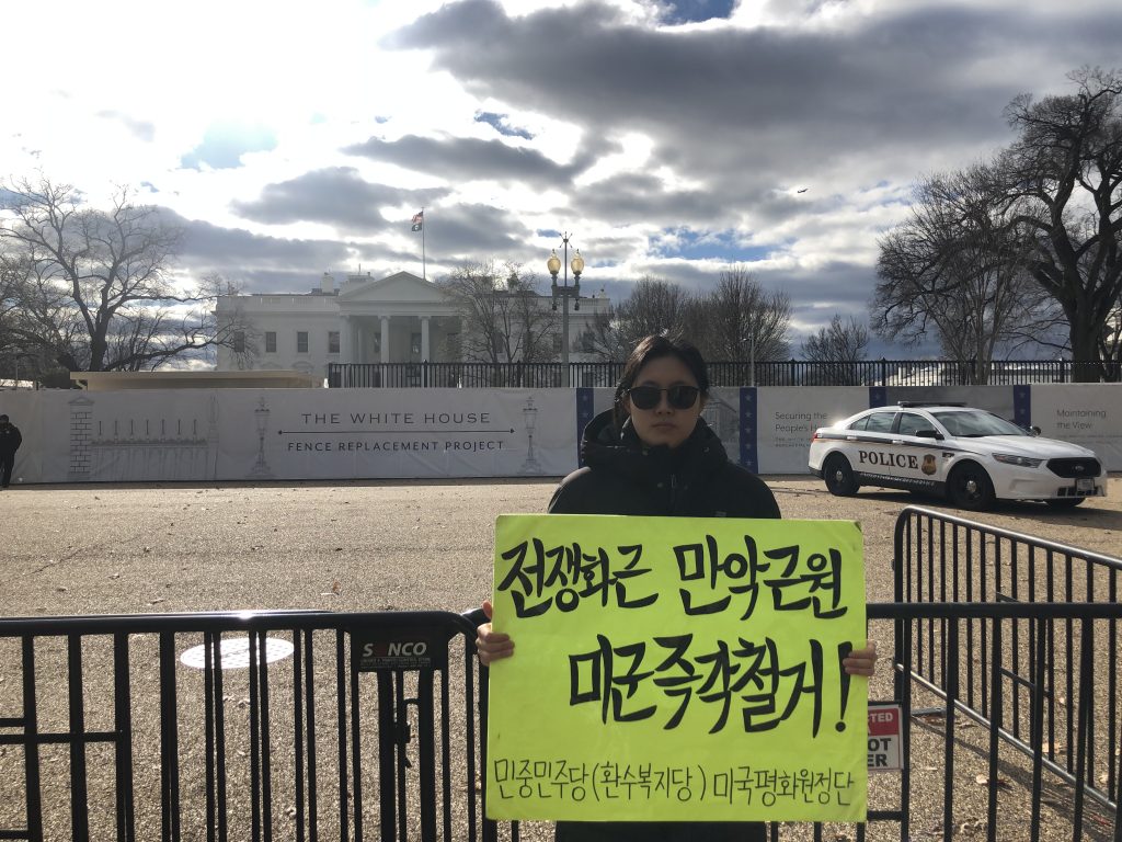 미국원정民해외원정 1.2~5 〈미군철거!〉 미백악관앞 평화시위 총 974일째 2020년 1월 6일 FacebookTwitter 민중민주당(환수복지당) 미국평화원정단은 5일(현지시간) 워싱턴D.C백악관앞에서 <전쟁화근 만악근원 미군즉각철거!>, <북미협상결렬 트럼프정부규탄!>, <미군유지비증액 트럼프정부규탄!>, <북침전쟁망언 트럼프정부규탄!>, <북침전쟁연습 영구중단!> 등을 촉구하는 평화시위를 총974일째 진행했습니다.