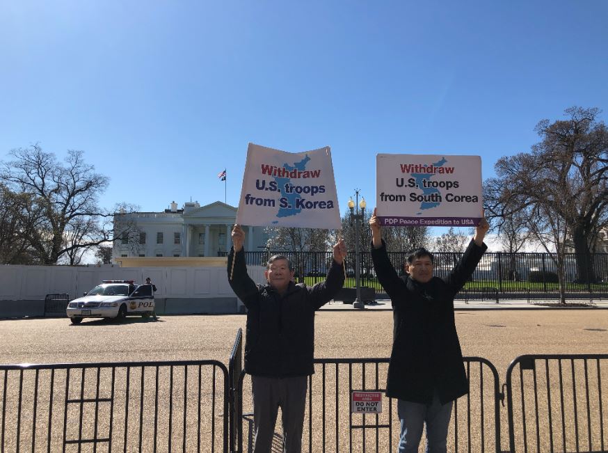 民해외원정미국원정 2.29~3.4 〈주남미군즉각철거!〉 9차미국평화원정 5일째 .. 백악관앞시위 총1033일째 2020년 3월 5일 FacebookTwitter 민중민주당(환수복지당) 미국평화원정단은 4일(현지시간) 워싱턴D.C백악관앞에서 <전쟁화근 만악근원 미군즉각철거!>, <미군유지비증액 트럼프정부규탄!>, <제국주의침략전쟁반대! 호르무즈해협파병반대!> 등을 촉구하는 평화시위를 총1033일째 진행했습니다.