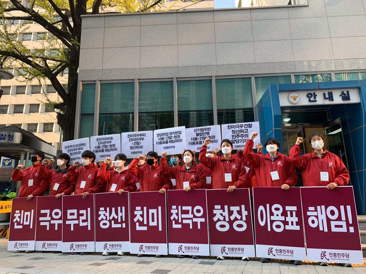 당원들은 구호 <선거법위반 불법만행 서울<견찰>청장 이용표를 해임하라!>·<정당탄압 정치탄압 서울<견찰>청장 이용표를 해임하라!>·<친미극우비호 친미친극우 서울<견찰>청장 이용표를 해임하라!>를 외쳤다.