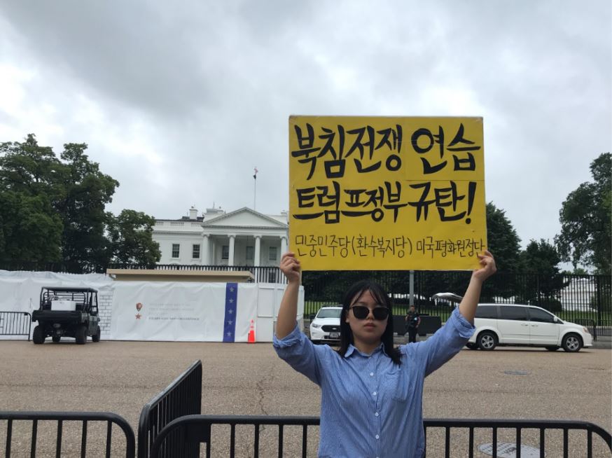 민중민주당(환수복지당) 미국평화원정단은 28일(현지시간) 워싱턴D.C백악관앞에서 <전쟁화근 만악근원 미군즉각철거!>, <미군유지비증액 트럼프정부규탄!>, <북침전쟁연습 트럼프정부규탄!> 등을 촉구하는 평화시위를 총1117일째 진행했다.