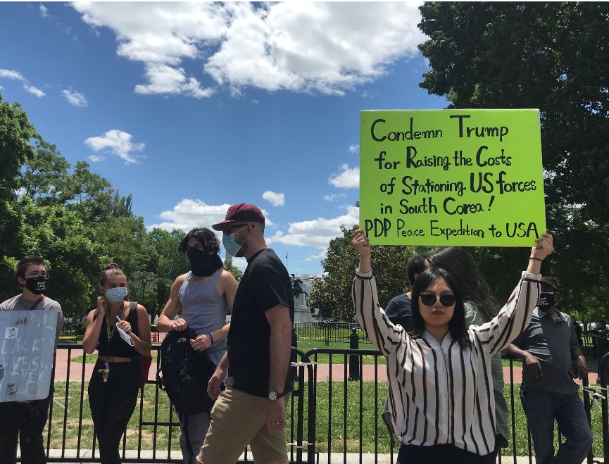 민중민주당(환수복지당) 미국평화원정단은 31일(현지시간) 워싱턴D.C백악관앞에서 <전쟁화근 만악근원 미군즉각철거!>, <미군유지비증액 트럼프정부규탄!>, <북침전쟁연습 트럼프정부규탄!> 등을 촉구하는 평화시위를 총1120일째 진행했다.