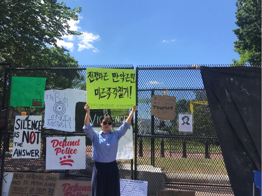 민중민주당(환수복지당) 미국평화원정단은 7일(현지시간) 워싱턴D.C백악관앞에서 <전쟁화근 만악근원 미군즉각철거!>, <미군유지비증액 트럼프정부규탄!>, <북침전쟁연습 트럼프정부규탄!>, <미제국주의 아래에서 우리는 숨쉴수없다>, <미제국주의는 전세계 민중의 생명위협을 그만두라> 등을 촉구하는 평화시위를 총1127일째 진행했다.
