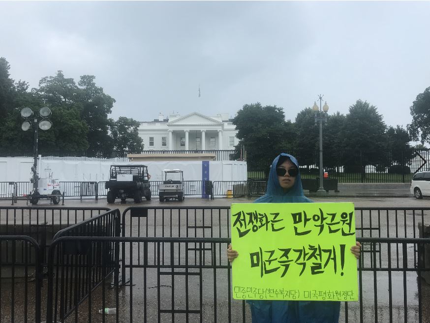 민중민주당(환수복지당) 미국평화원정단은 11일(현지시간) 워싱턴D.C백악관앞에서 <전쟁화근 만악근원 미군즉각철거!>, <미군유지비증액 트럼프정부규탄!>, <북침전쟁연습 트럼프정부규탄!>, <미제국주의 아래에서 우리는 숨쉴수없다>, <미제국주의는 전세계 민중의 생명위협을 그만두라> 등을 촉구하는 평화시위를 총1131일째 진행했다.