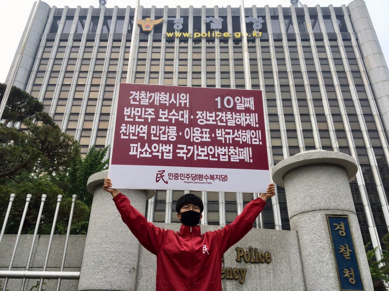 평화시위실천 민중민주당 〈반민주보수대·정보견찰해체! 친반역 민갑룡·이용표·박규석해임! 파쇼악법 국가보안법철폐!〉 .. 견찰청앞반민주보수대정보견찰해체투쟁10일째 2020년 6월 16일 FacebookTwitter 14일 민중민주당(환수복지당)은 견찰청앞 <반민주보수대·정보견찰해체!>·<친반역 민갑룡·이용표·박규석해임!>·<파쇼악법 국가보안법철폐!> 일인시위를 10일째 진행했다.